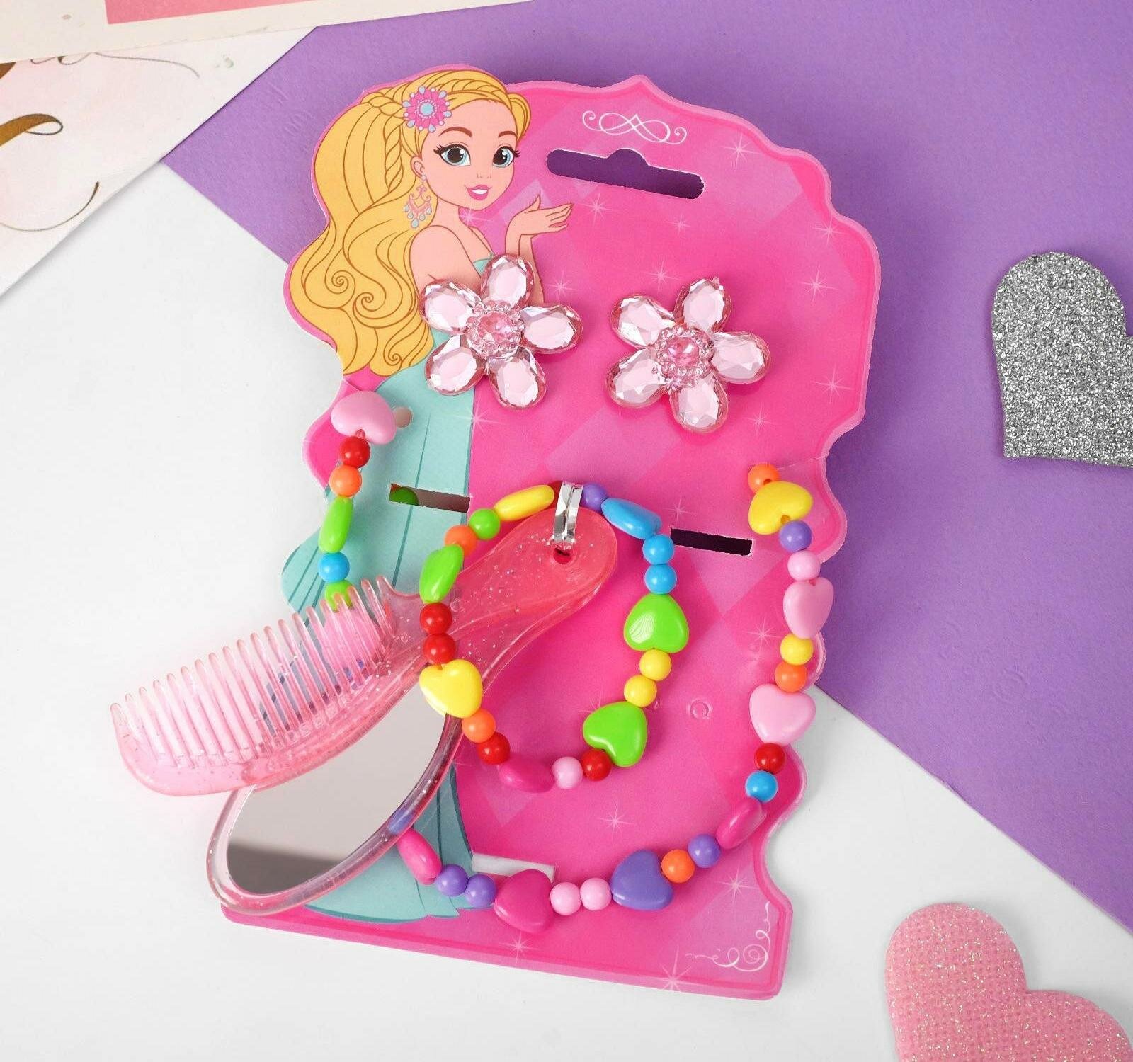 Комплект детский "Выбражулька" 5 предметов: 2 резинки, бусы, браслет, кольцо, цветочек, цвет розовый