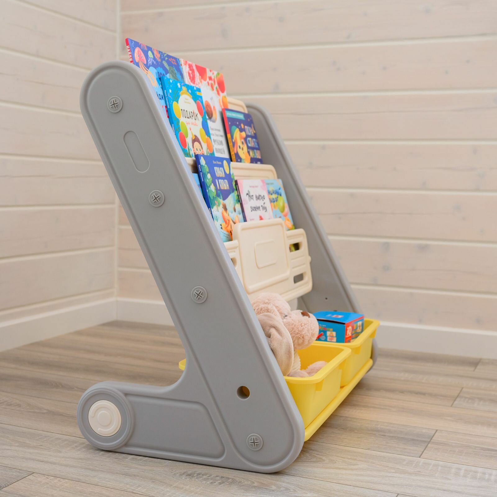Стеллаж для игрушек UNIX Kids Cosmo 2 напольный на колесиках, с ящиками, пластиковый открытый стеллаж этажерка в детскую комнату для хранения, серый