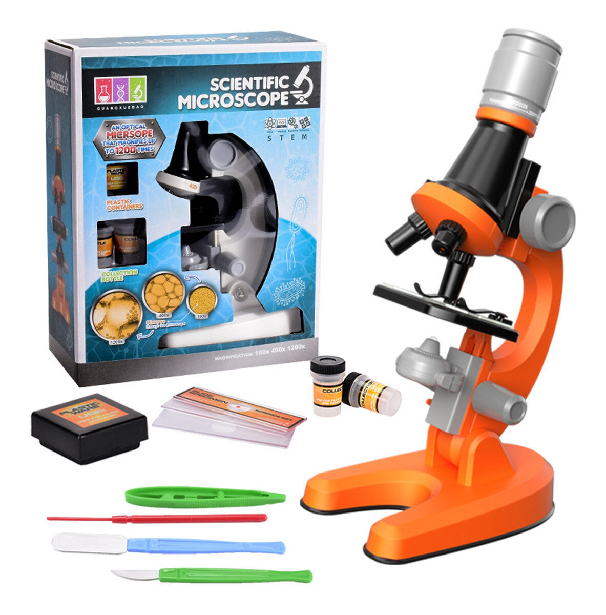 Детский Микроскоп Юный ученый с 3 объективами: 100х, 400х, 1200х, подсветка, цвет оранжевый / Набор для опытов / Подарок интересное:
