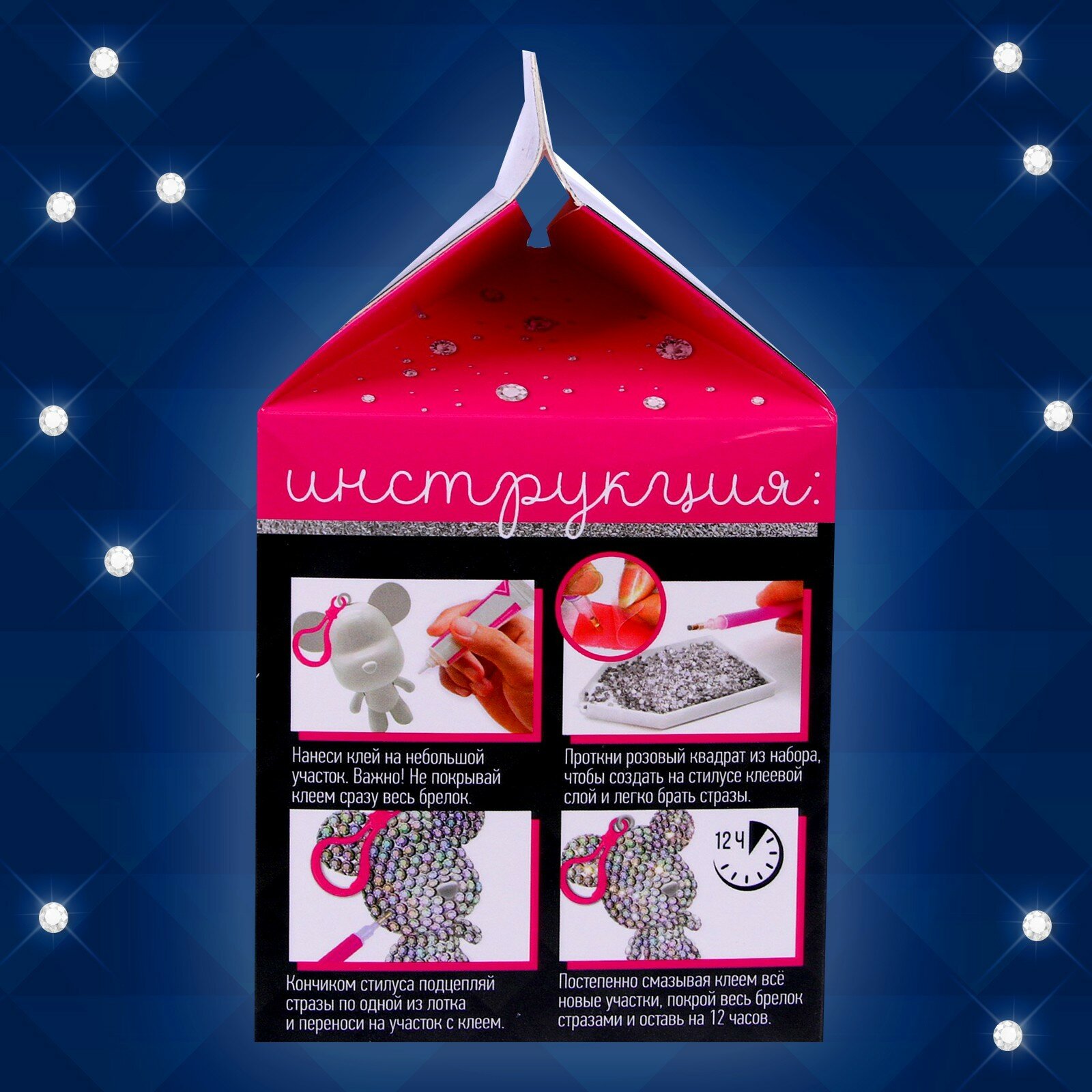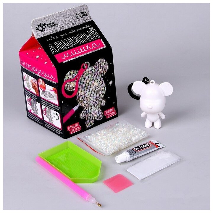 | Комплектация | пластиковый мишка с карабином; пакетик со стразами; поддон для страз; стилус; клеевая подушечка; одноразовые перчатки; клей. |