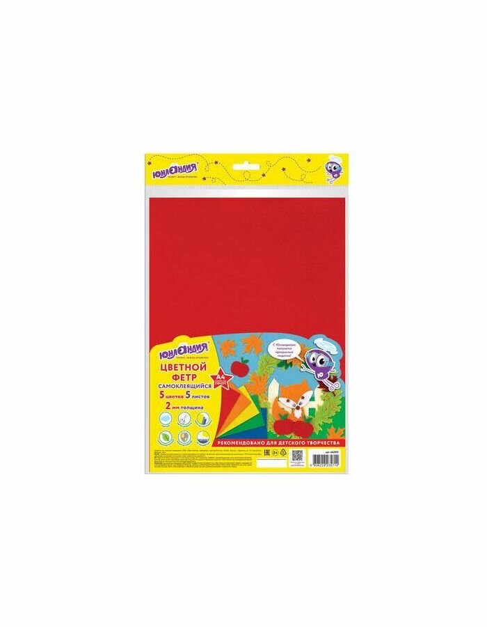 | Комплектация | Цветной фетр для творчества А4 ЮНЛАНДИЯ САМОКЛЕЯЩИЙСЯ, 5 ЯРКИХ ЦВЕТОВ, с европодвесом, 662051 |