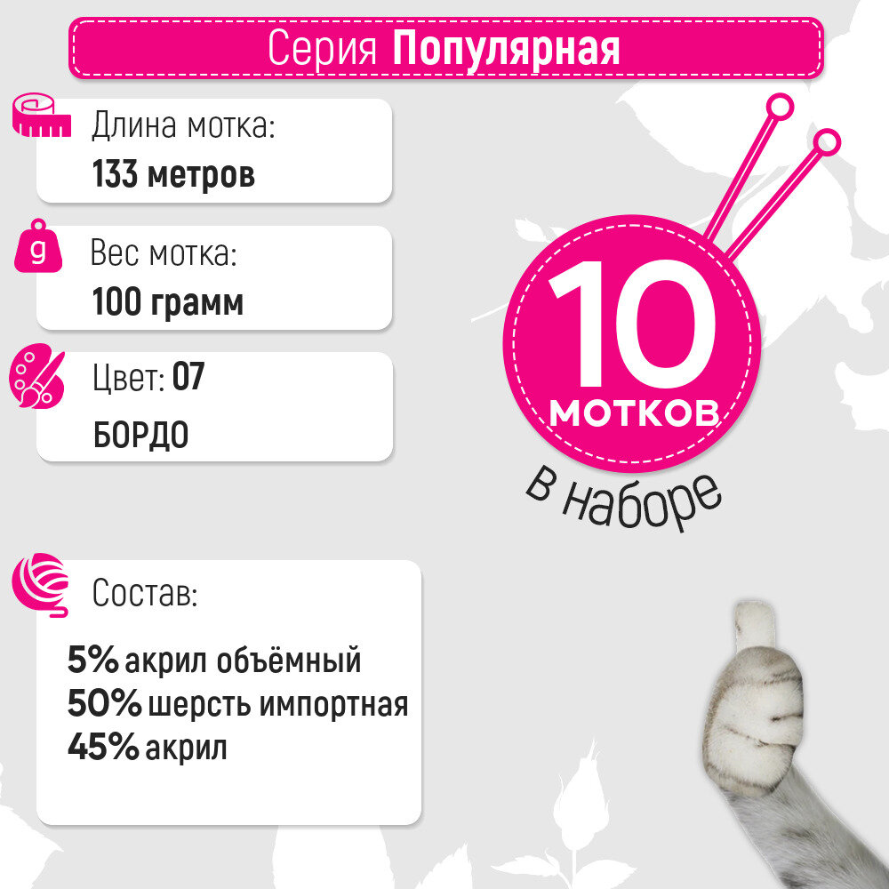 Купить Пряжа для вязания Пехорка 'Популярная', 100г, 133м (50% шерсть, 50% акрил) (07-Бордо), 10 мотков