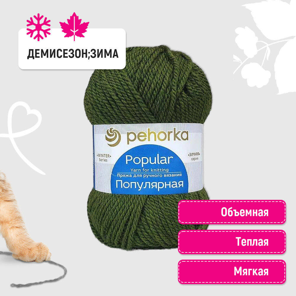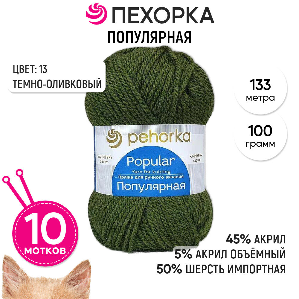 Пряжа Пехорка Популярная темно-оливковый -хаки (013), 50%шерсть/50%акрил, 133м, 100г, 1шт