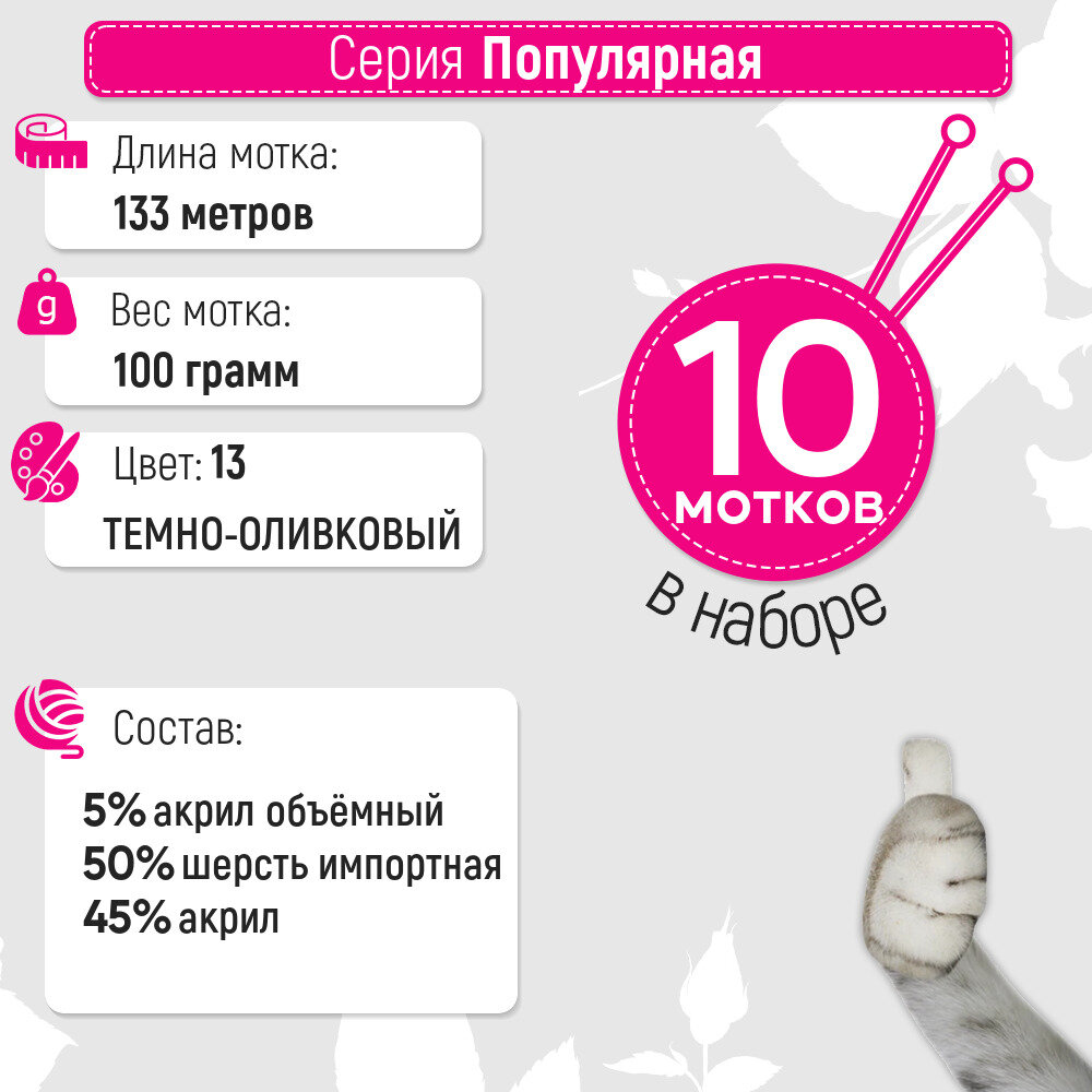 СохранитьПряжа Пехорская ПТ "Популярная" 50% шерсть, 50% акрил 10 шт.х100г 133м №013 тёмно-оливковый интересное: