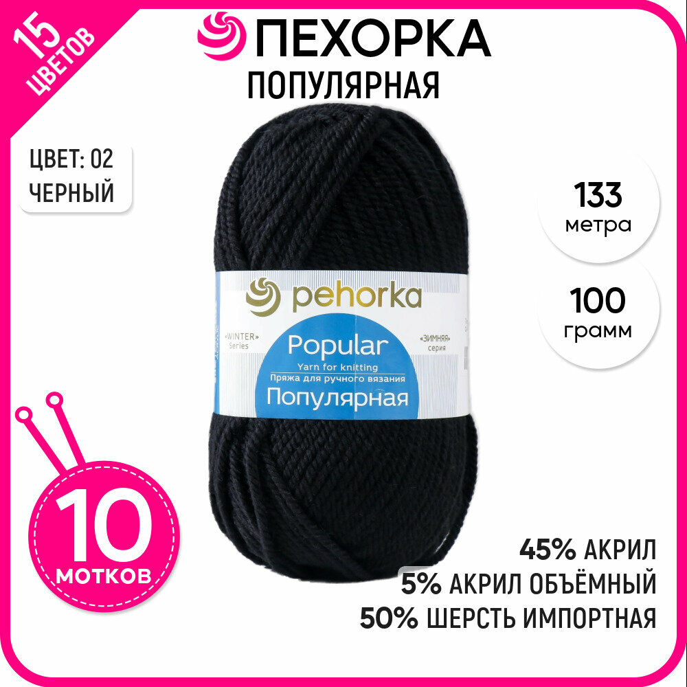 Купить Пряжа для вязания Пехорка 'Популярная', 100г, 133м (50% шерсть, 50% акрил) (02-Черный), 10 мотков