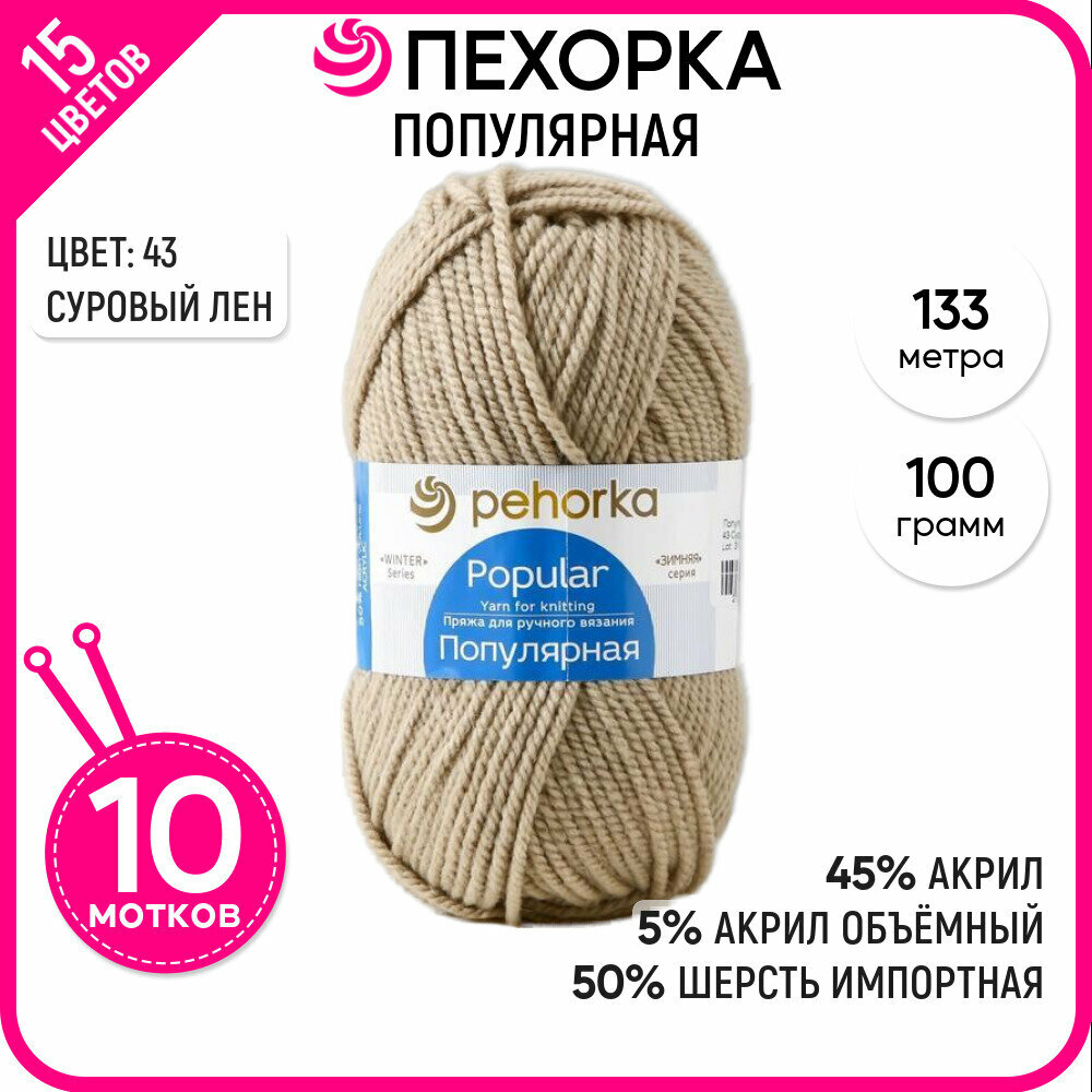Купить Пряжа для вязания Пехорка 'Популярная', 100г, 133м (50% шерсть, 50% акрил) (43-Суровый лен), 10 мотков