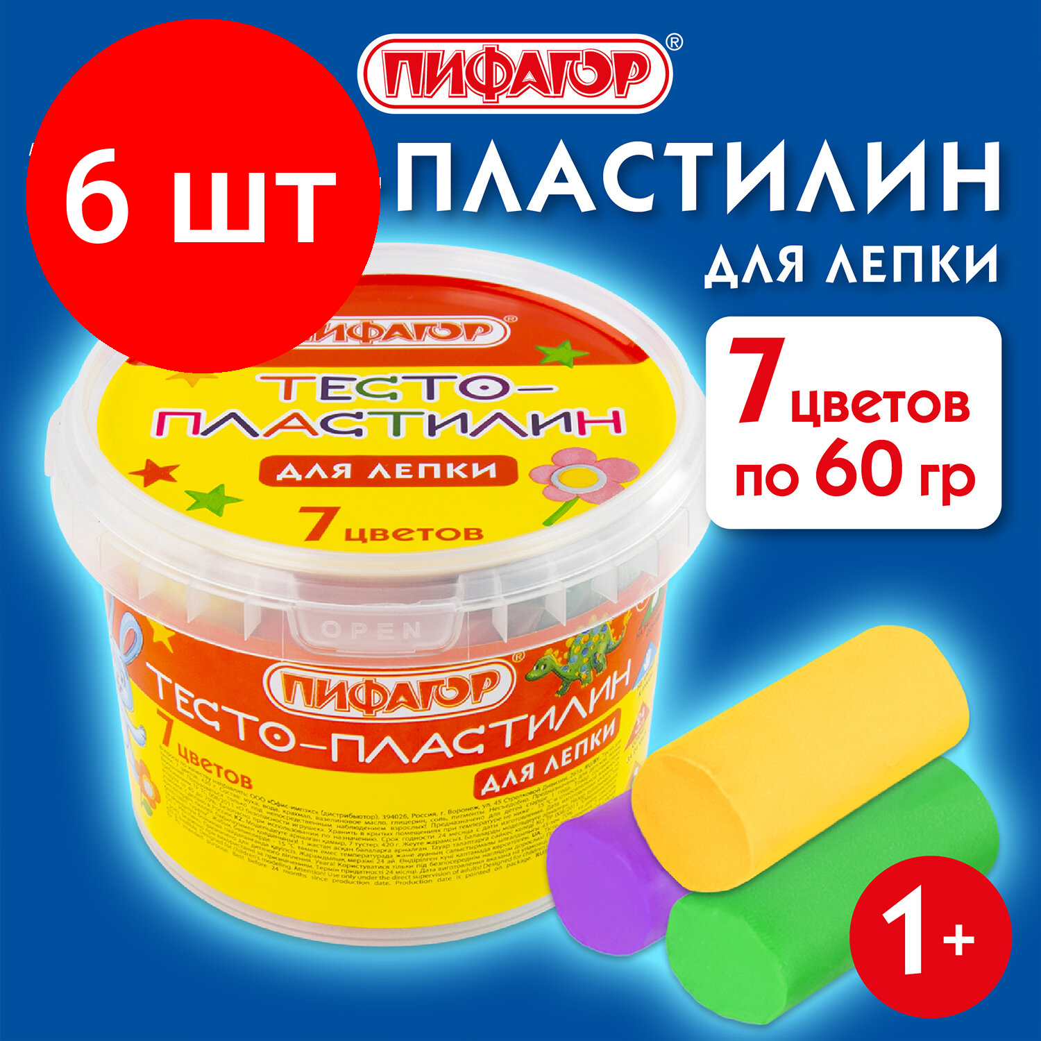Пластилин легкий мягкий воздушный для лепки (тесто для лепки) на растительной основе для детей Пифагор, набор из 7 цветов, 420 г, пластиковое ведро