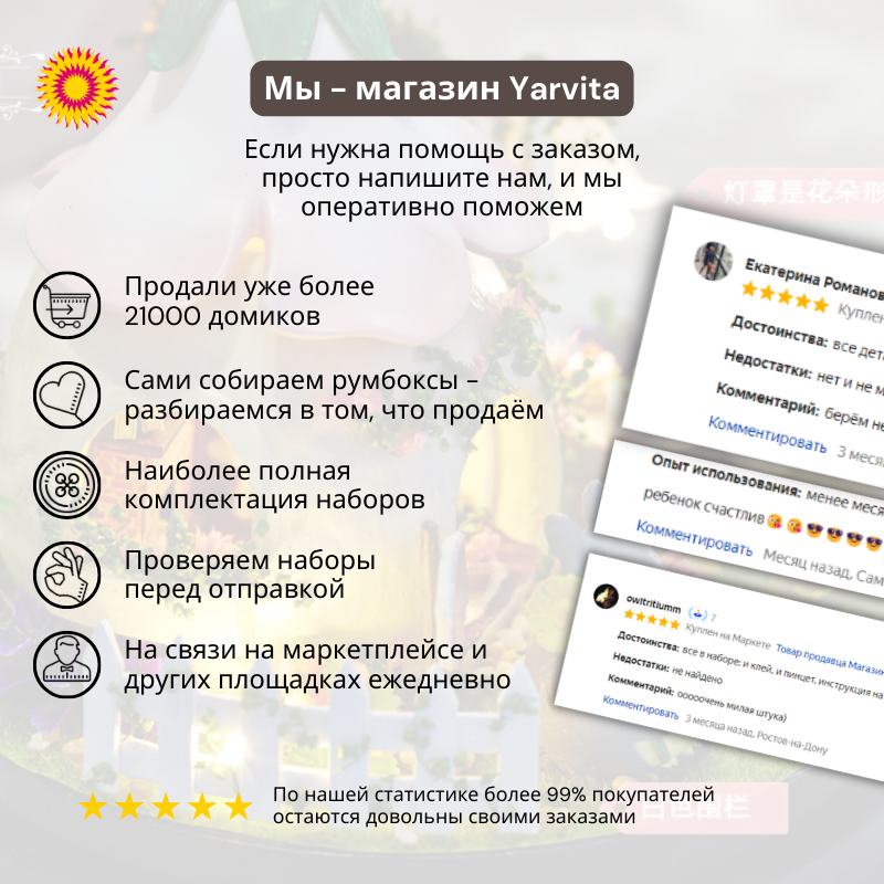 | Комплектация | батарейки / Иллюстрированная инструкция на русском языке / уютная светодиодная подсветка / белый клей / пинцет для сборки / детали для сборки / музыкальный механизм / купол для защиты от пыли. Подробную комплектацию читайте в описании. |