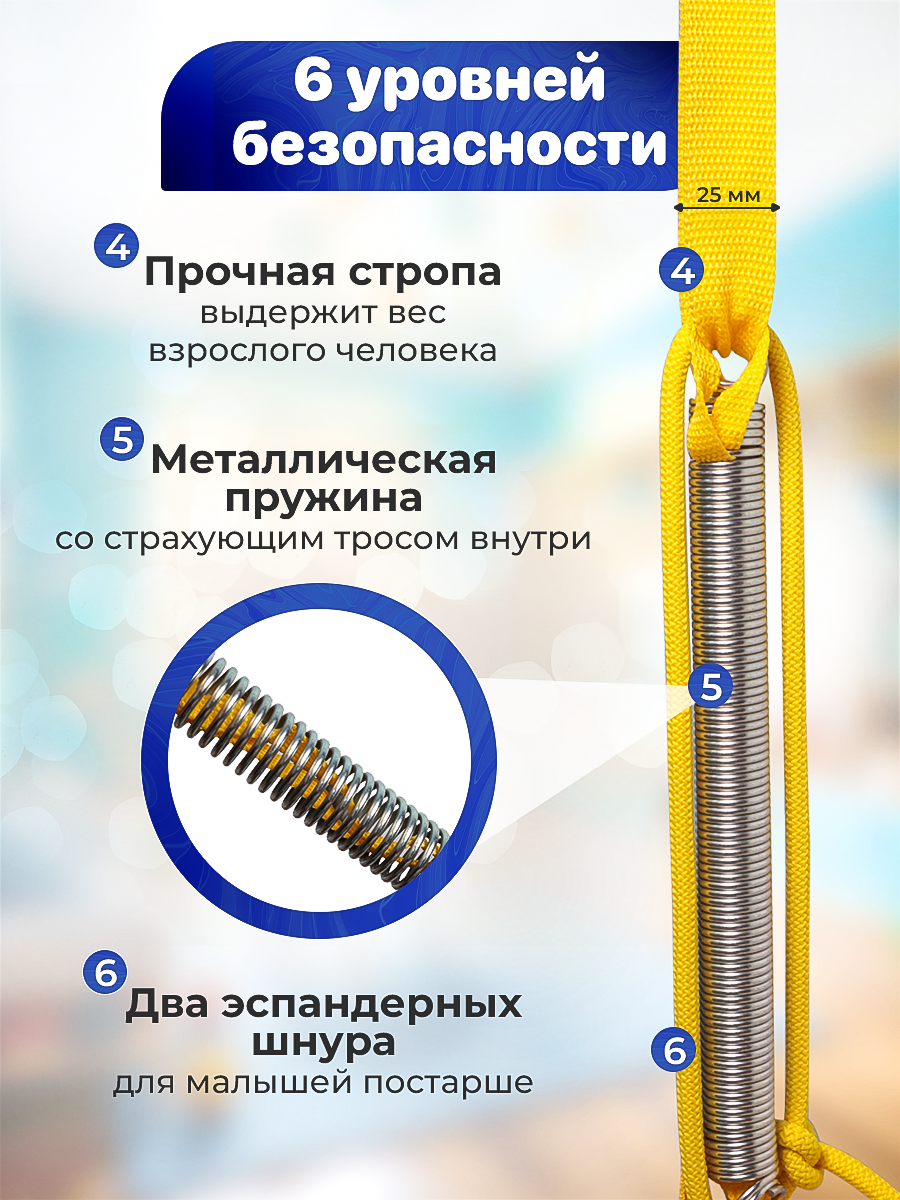 | Комплектация | прыгунки, пружина, эспандерный шнур, крюк качельный, дюбель, зацеп, доп. стропа, инструкция, пакет |