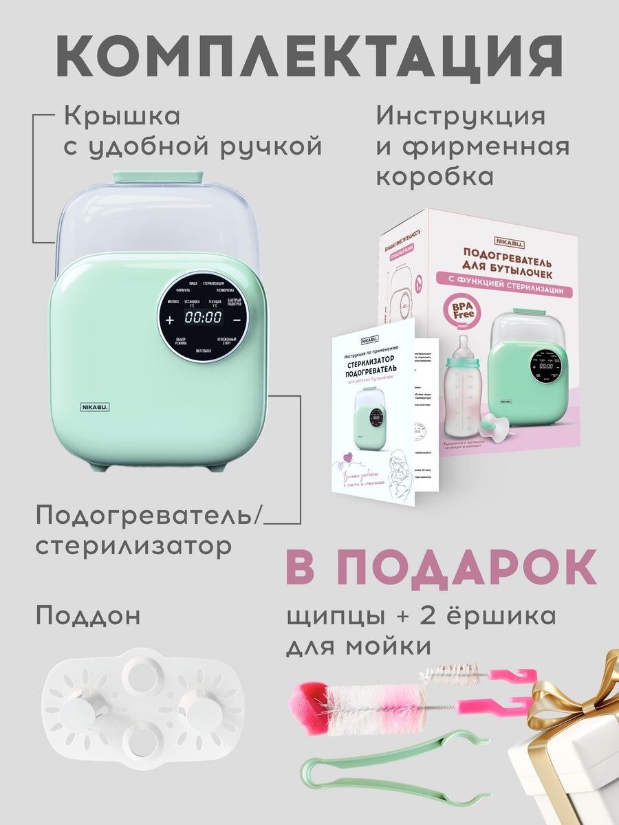 | Комплектация | подогреватель детского питания - 1 шт; Инструкция на русском языке - 1 шт; Ершики для мойки бутылочек - 2 шт; Щипцы для бутылочек; Стерилизатор |