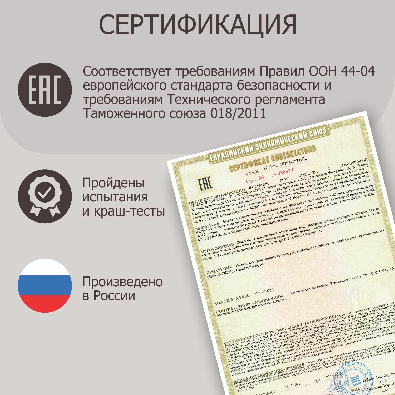 | Оценка краш-теста | ECE R44/04 |