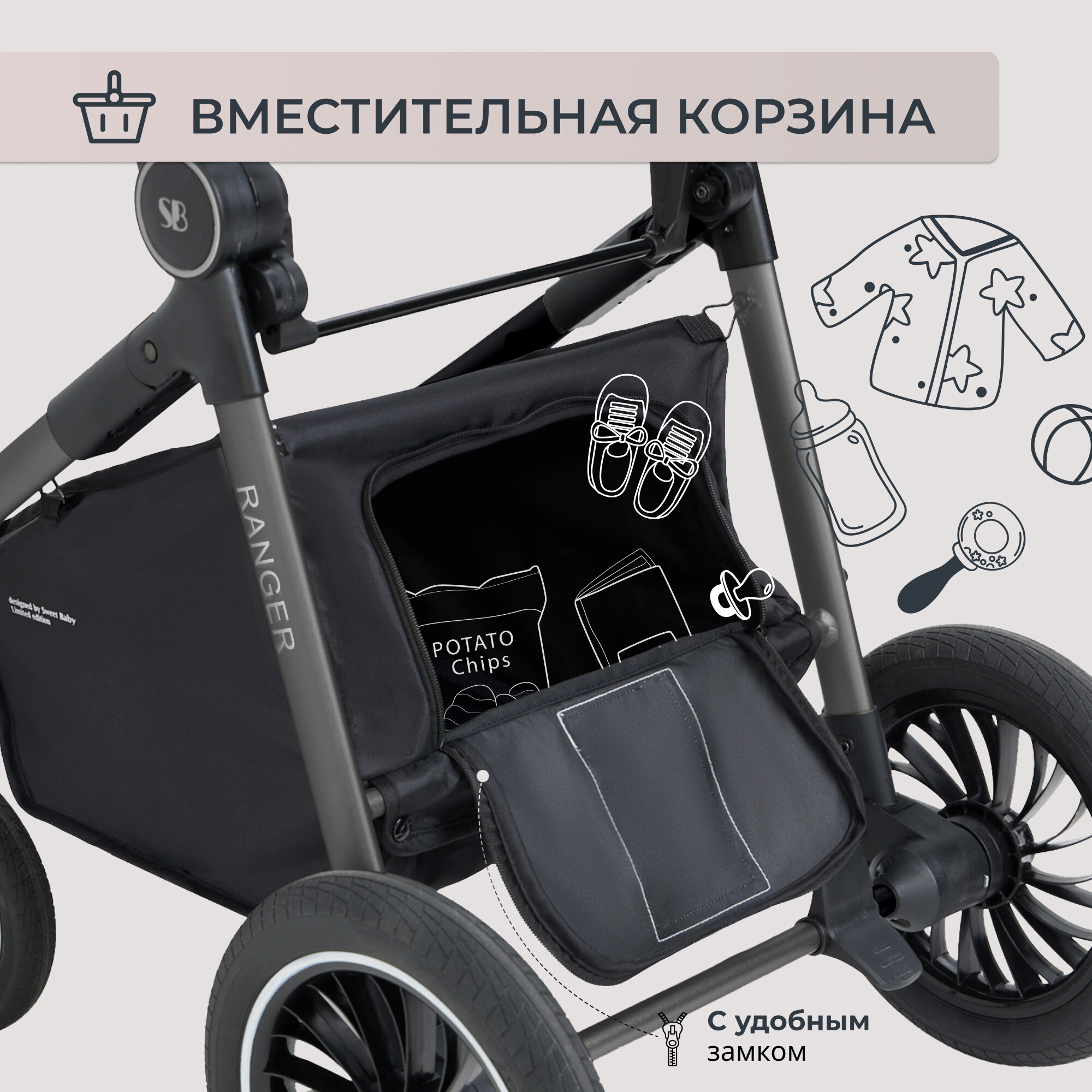 | Особенности шасси | корзина для покупок / перестановка блока лицом/спиной / регулировка высоты ручки / съемные колеса |