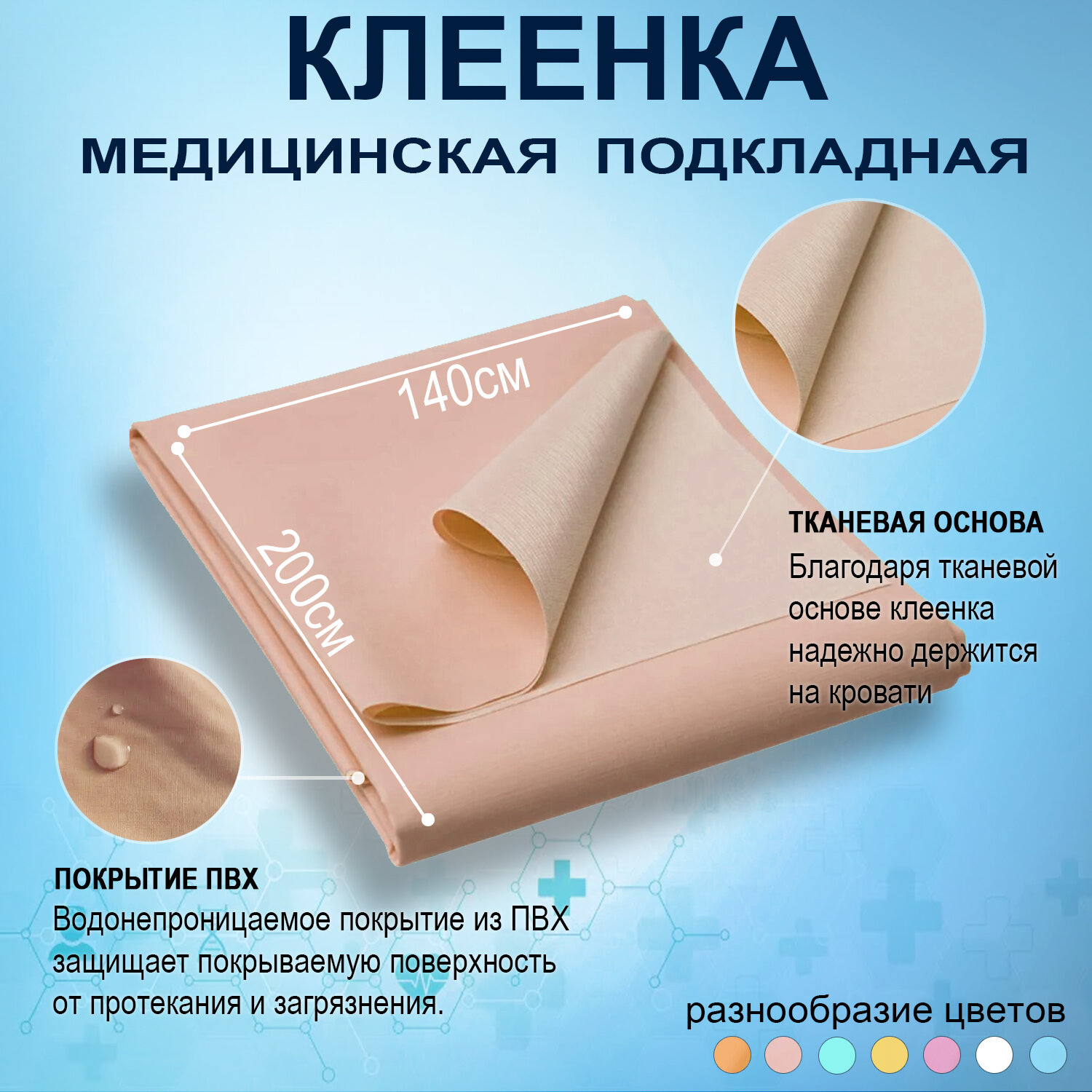 Клеенка медицинская подкладная с ПВХ-покрытием для лежачих больных 200x140см, цвет голубой