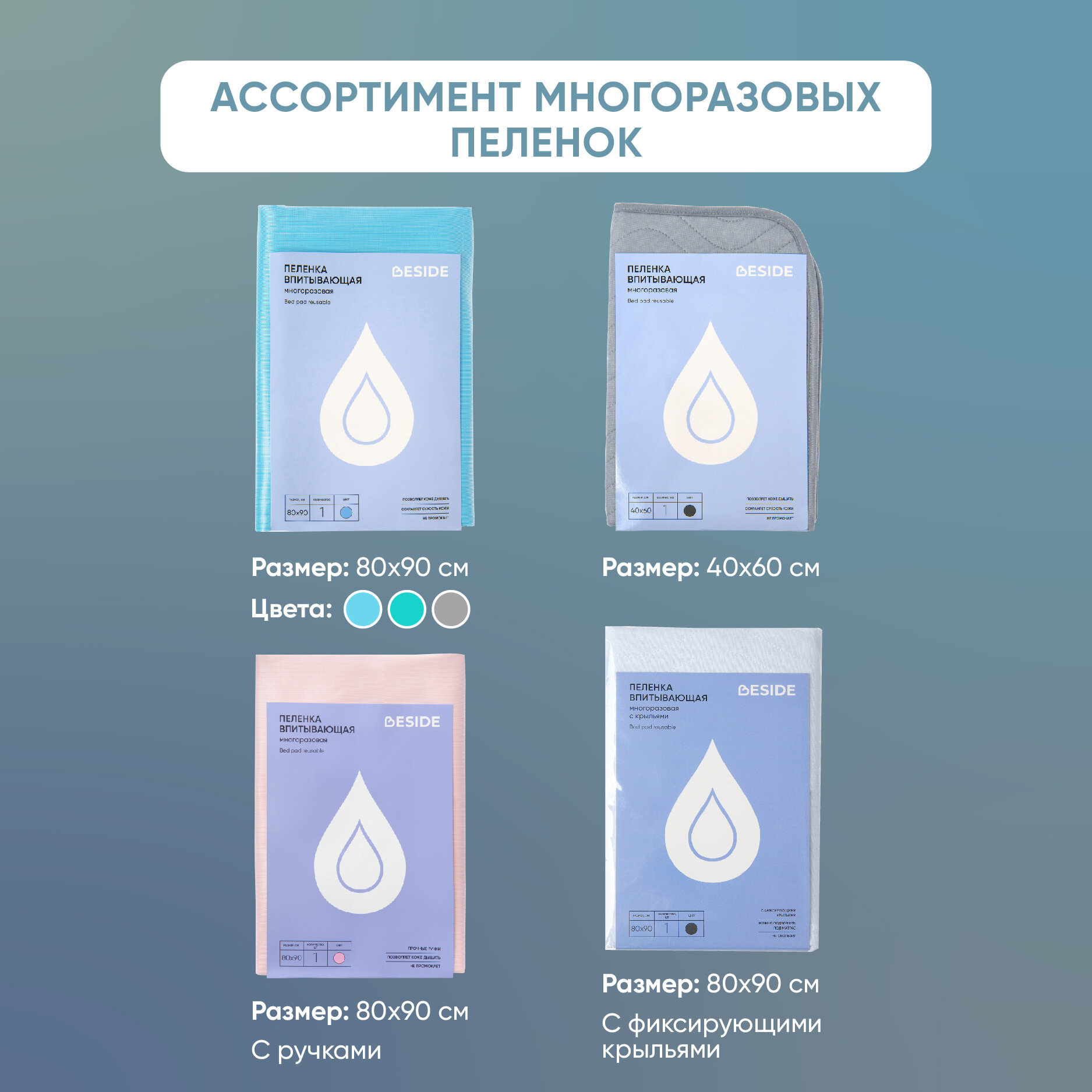 Многоразовая впитывающая пеленка с крыльями BESIDE волны, 80x90 см, хлопок полиэстер, ПВХ, бело-серая, клеенка подкладная водонепроницаемая непромокаемая для детей, новорожденных, взрослых, животных интересное: