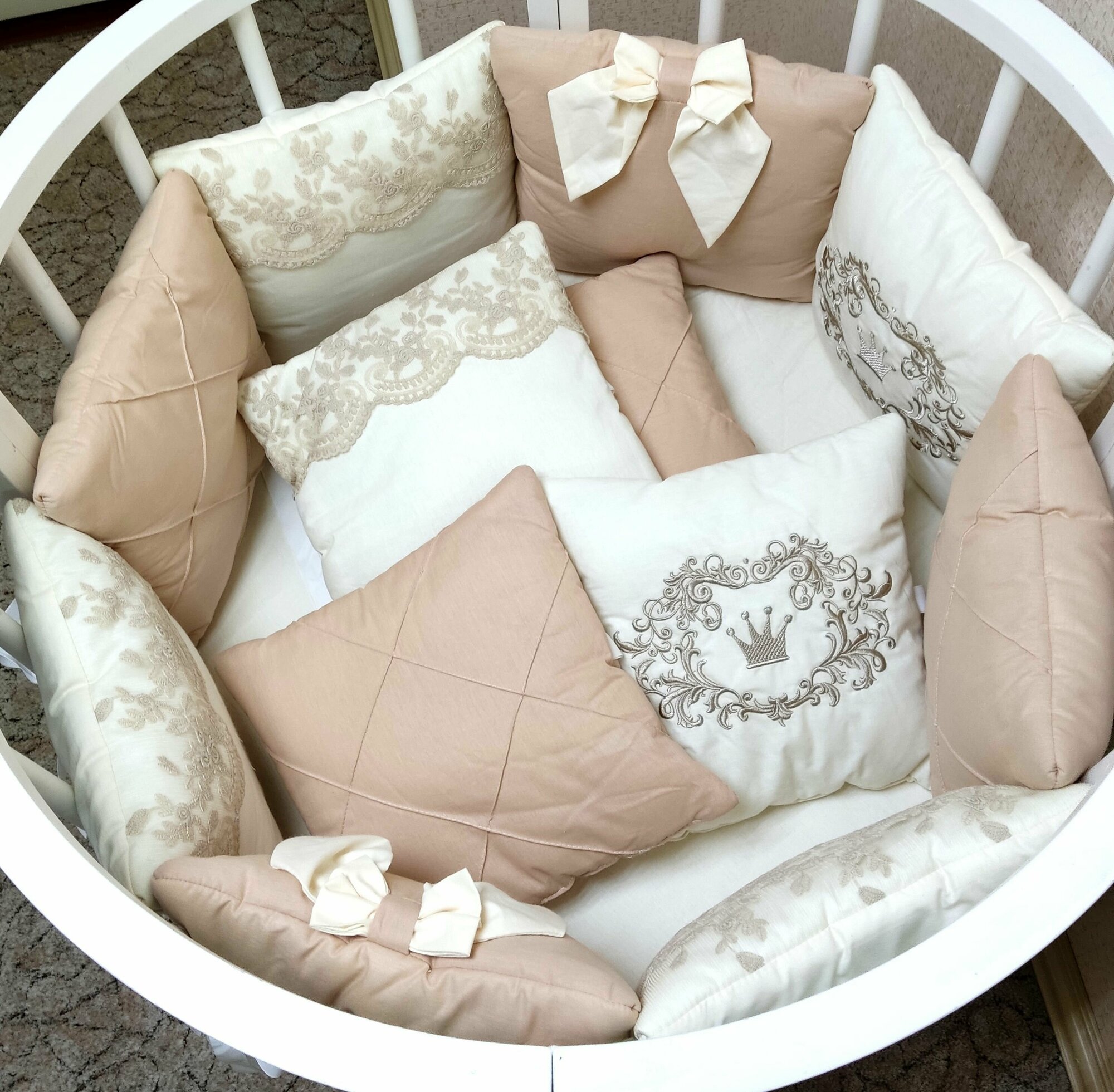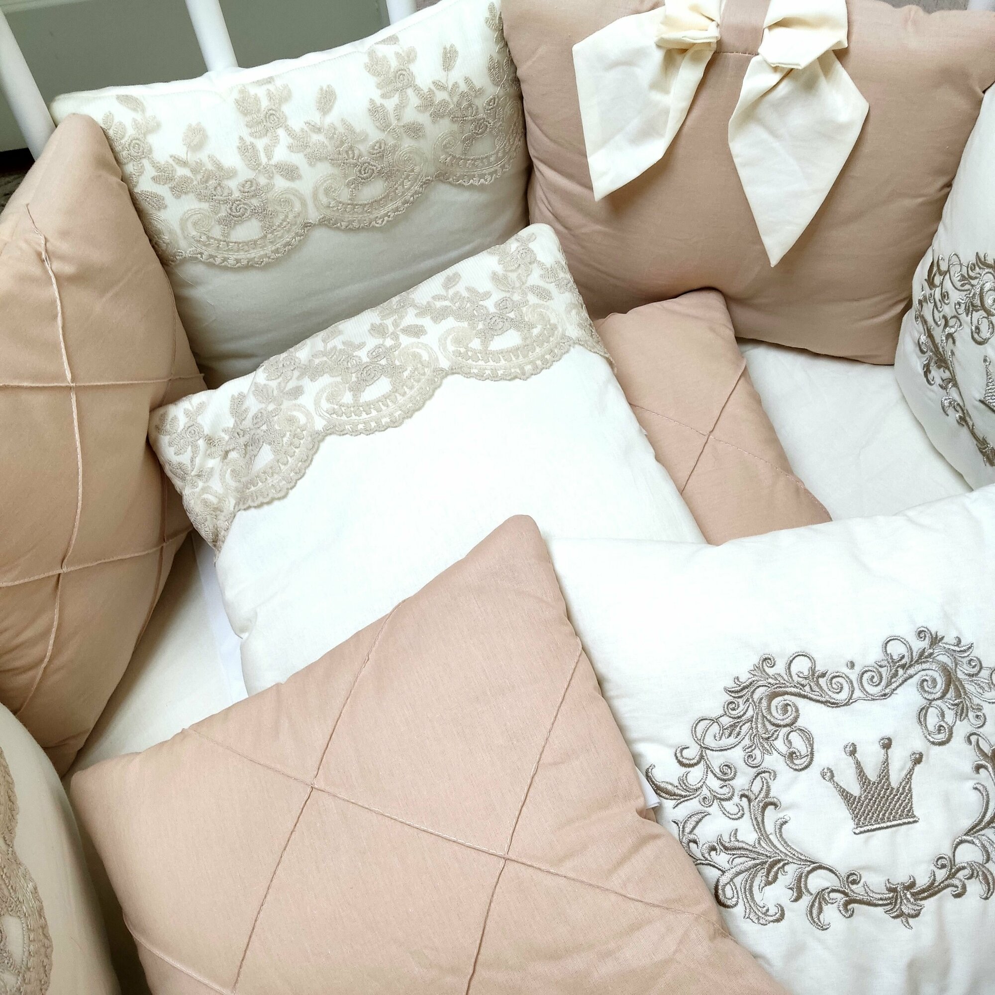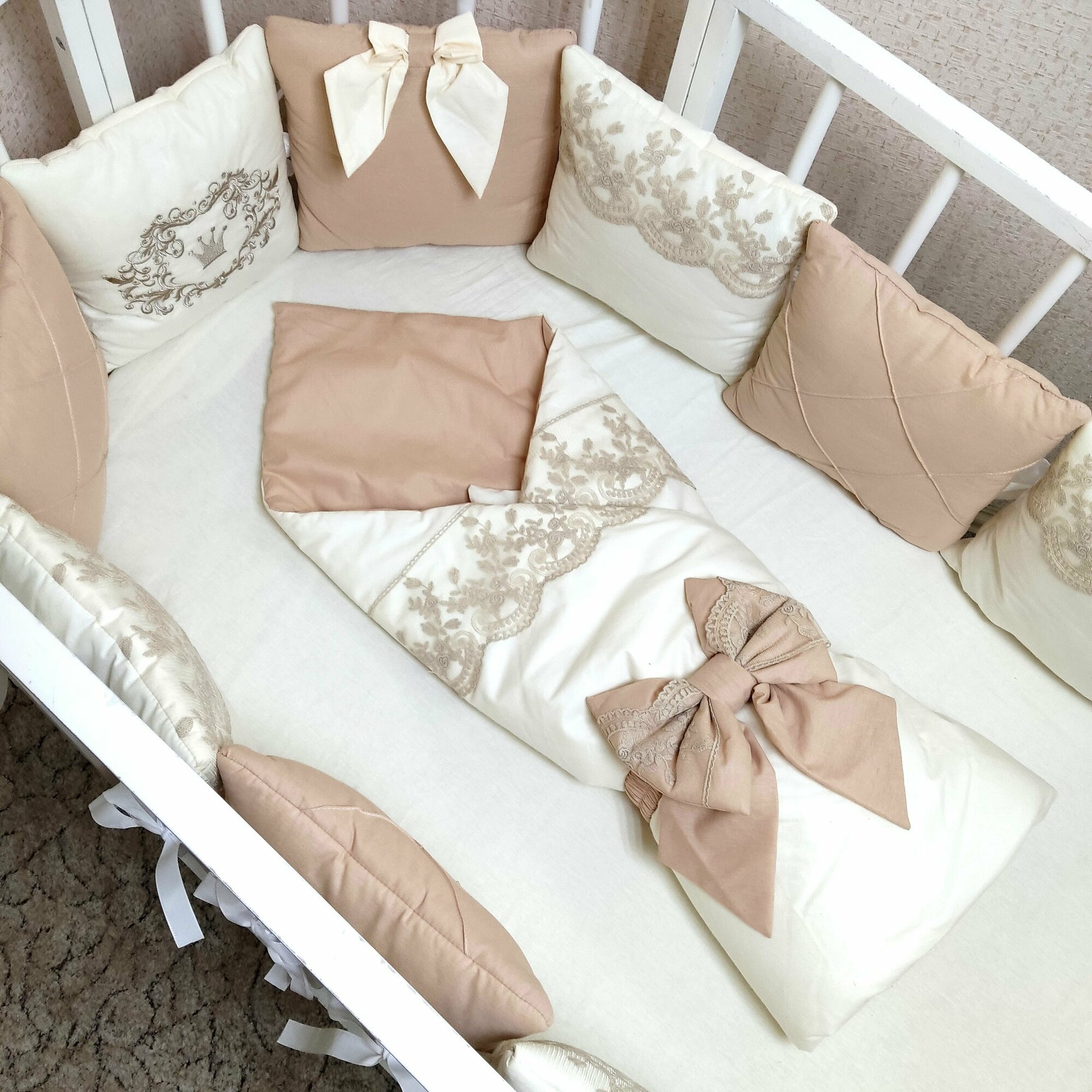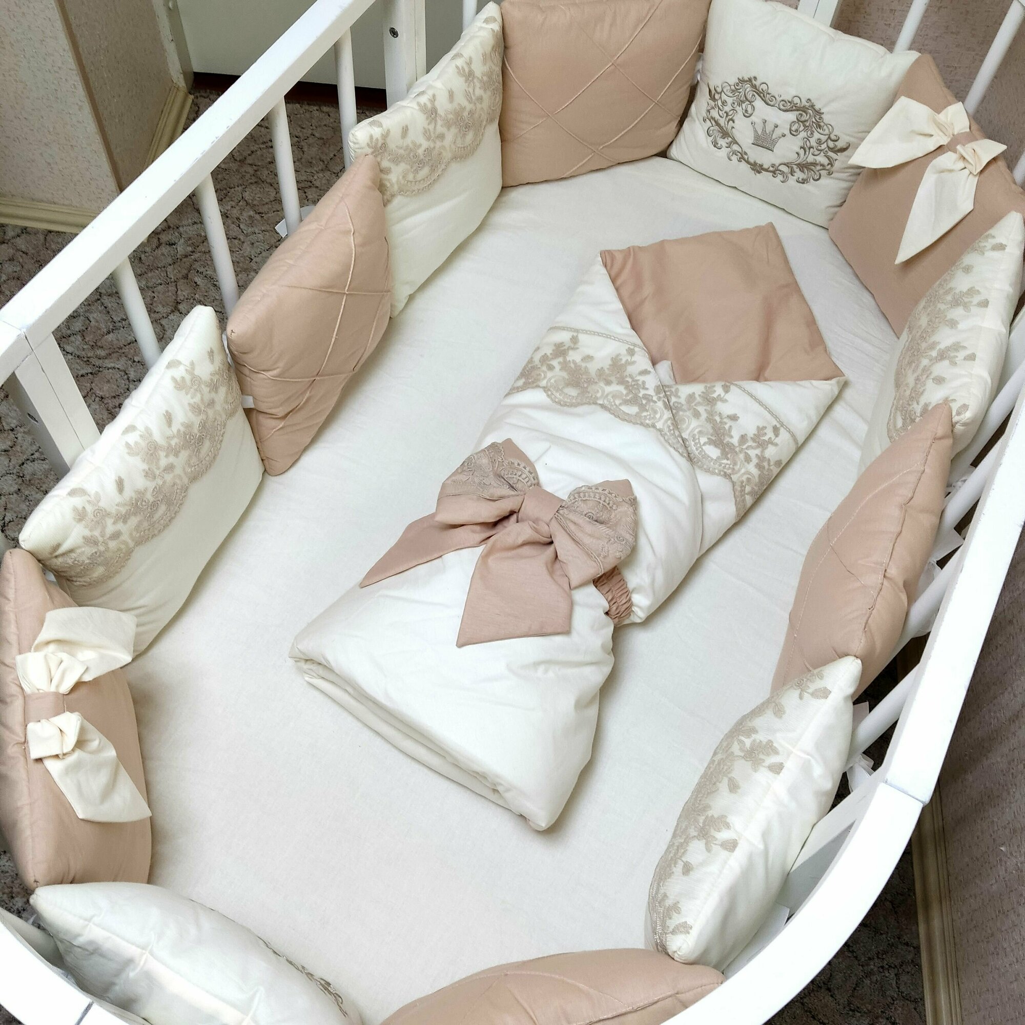 | Комплектация | В комплекте 12 бортиков-подушек, украшенных кружевом, вышивкой, каретный строчкой и бантами. Одеяло 110х110, подушка 40х60, пододеяльник 110х110, наволочка 40х60, простынка на резинке для спального места 60х120. Бант для одеяла. |