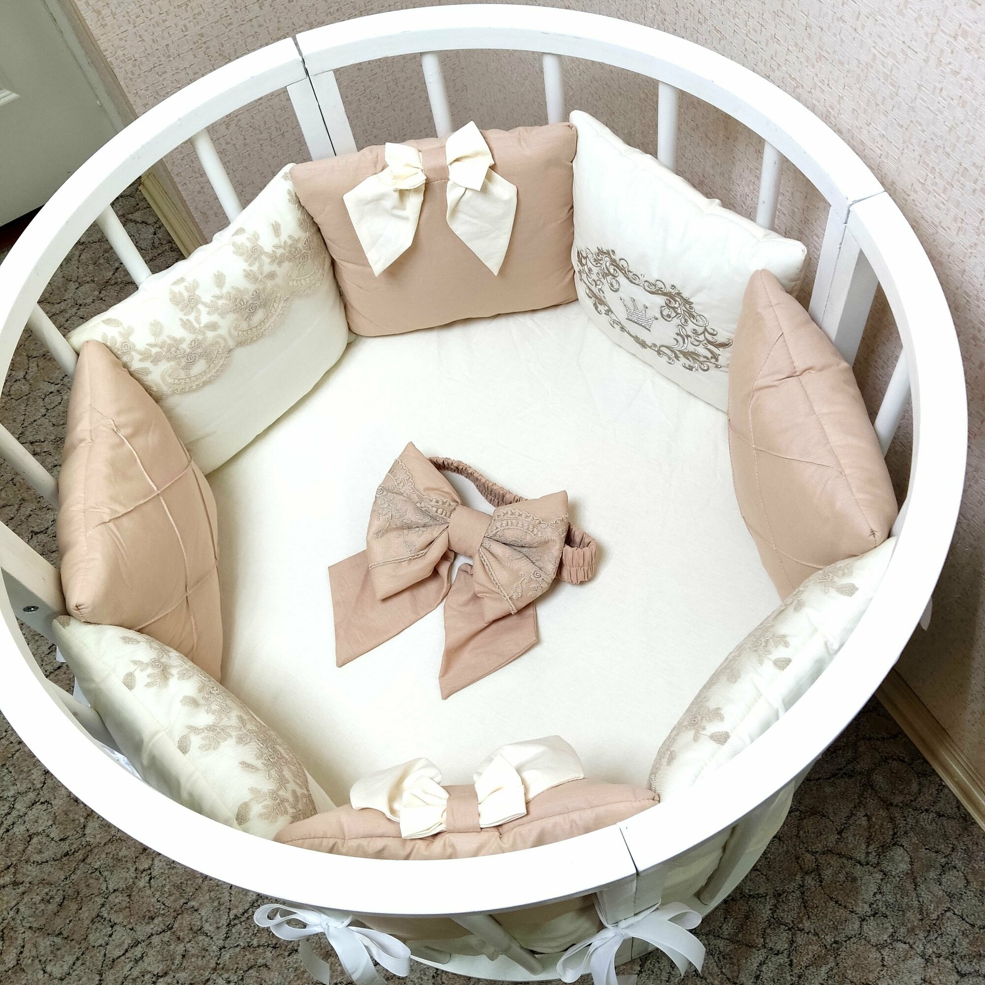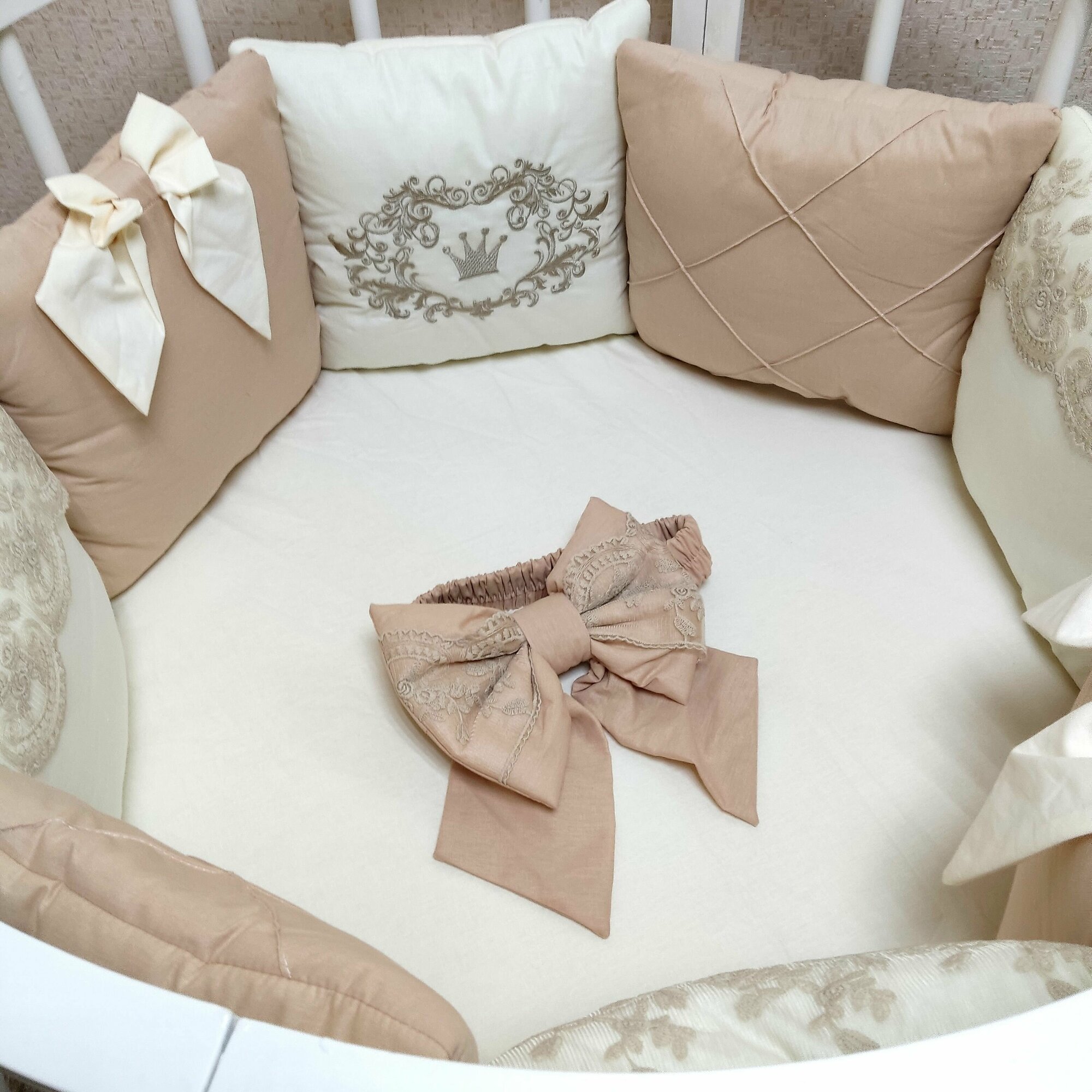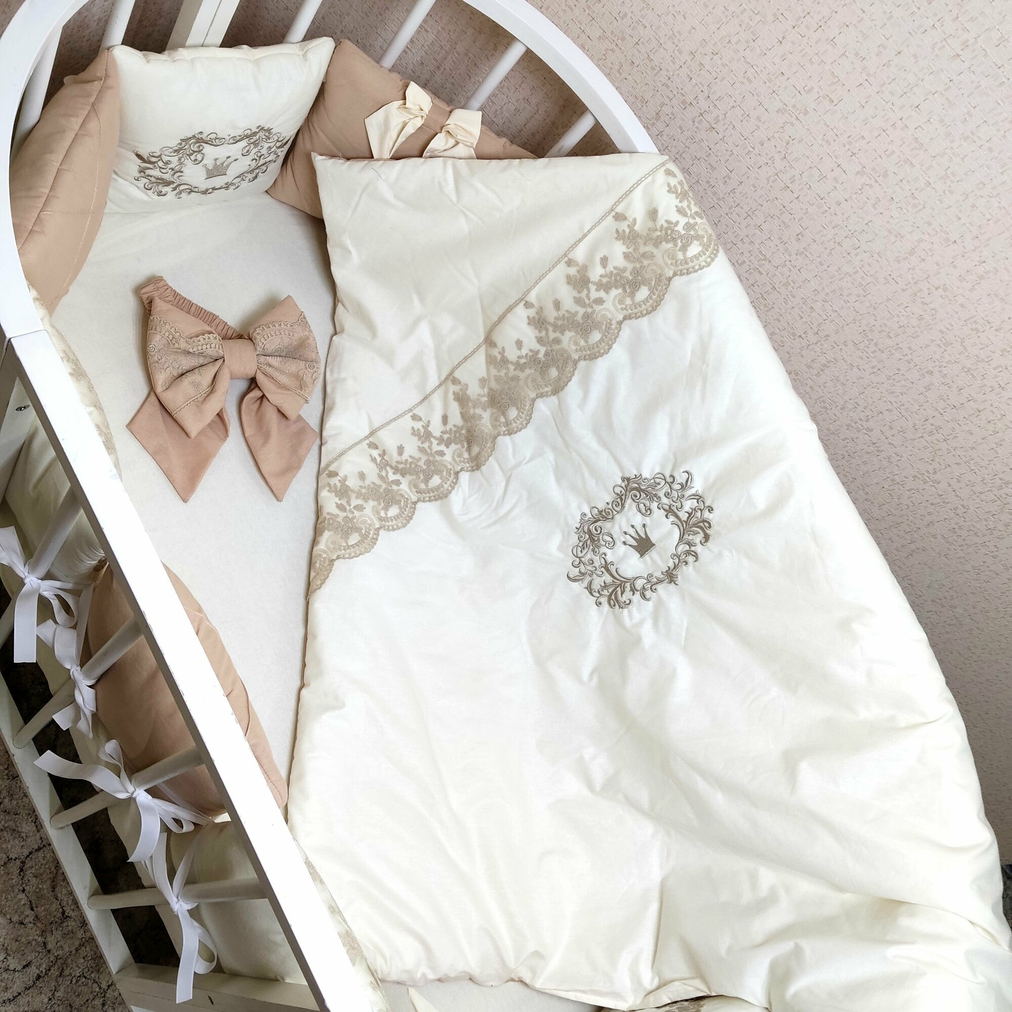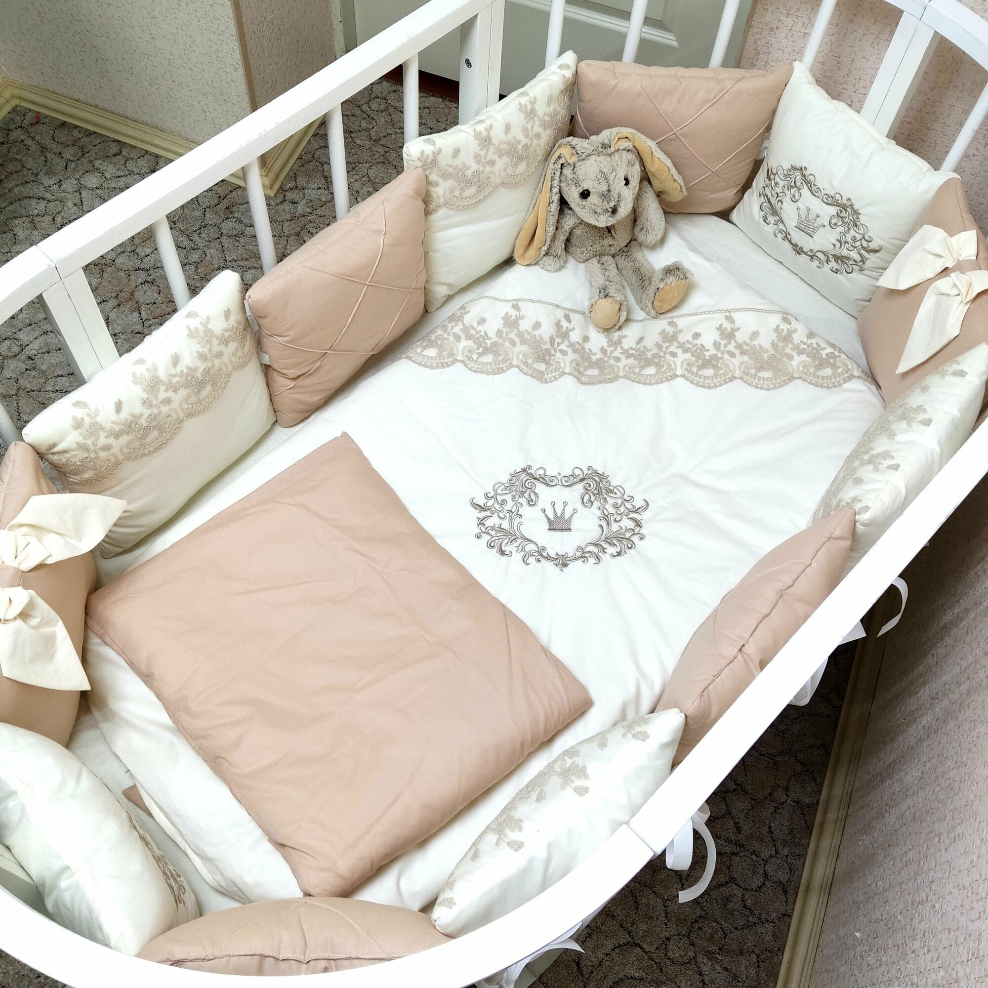 | Комплектация | В комплекте 12 бортиков-подушек, украшенных кружевом, вышивкой, каретный строчкой и бантами. Одеяло 110х110, подушка 40х60, пододеяльник 110х110, наволочка 40х60, простынка на резинке для спального места 60х120. Бант для одеяла. |