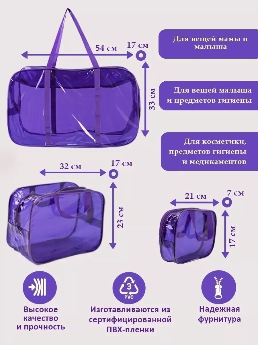 СохранитьПрозрачные сумки в роддом 3 шт., особо прочные, бренд "Золотой октябрь", цвет фиолетовый-лиловый интересное: