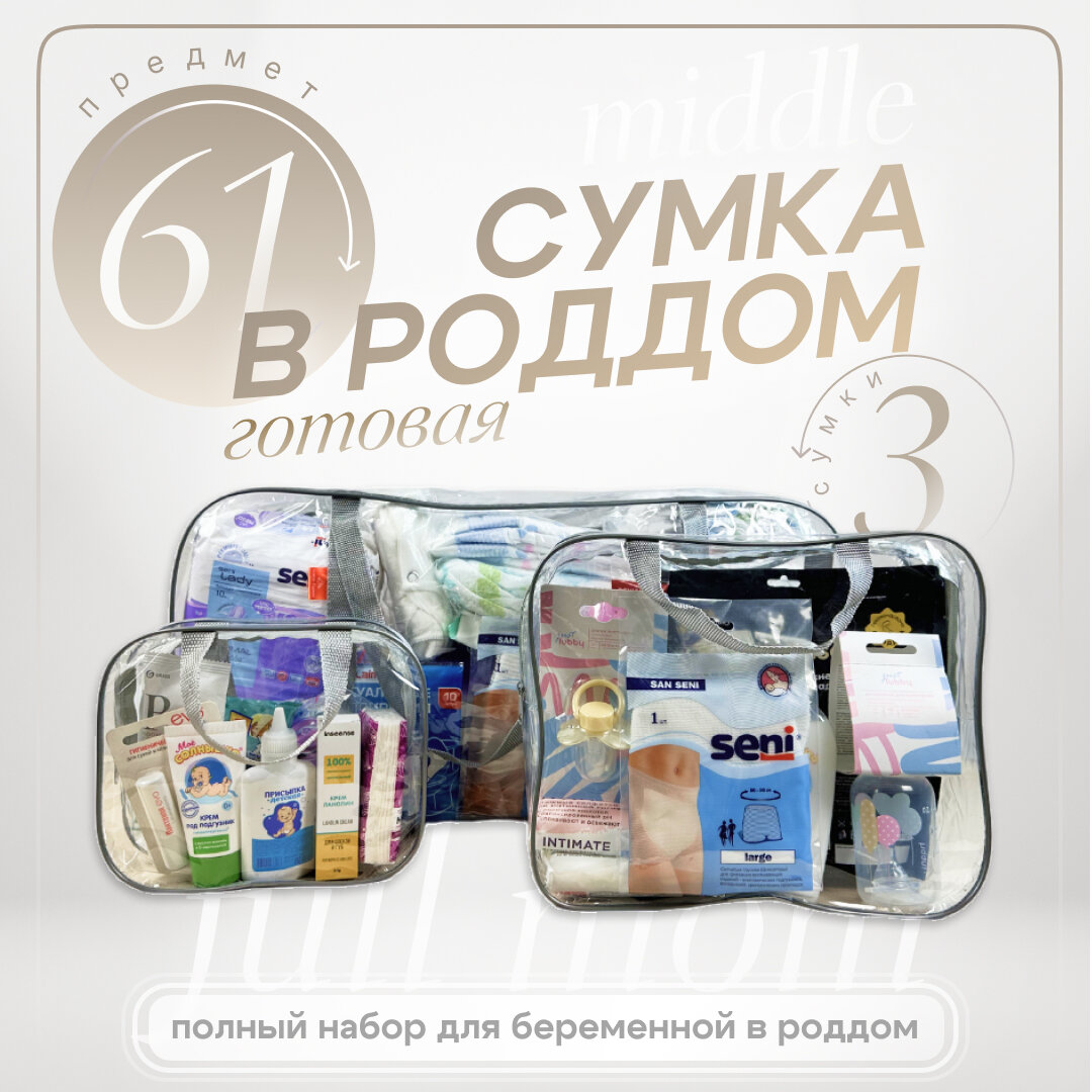 Сумка в роддом готовая для мамы и малыша с наполнением Full mom Middle, 61 предмет, прозрачная