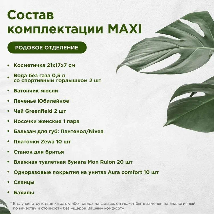 | Состав набора | бахилы, ватные диски, ватные палочки, влажная туалетная бумага, влажные салфетки, крем для сосков, мочалка, мыло, накладки для кормления, носочки для новорожденного, одноразовые маски, одноразовые покрытия на сиденье унитаза, пеленки для мамы, пеленки для новорожденного, подгузники, прокладки для груди, прокладки послеродовые, тапочки, шапочка для душа, шапочка для новорожденного |