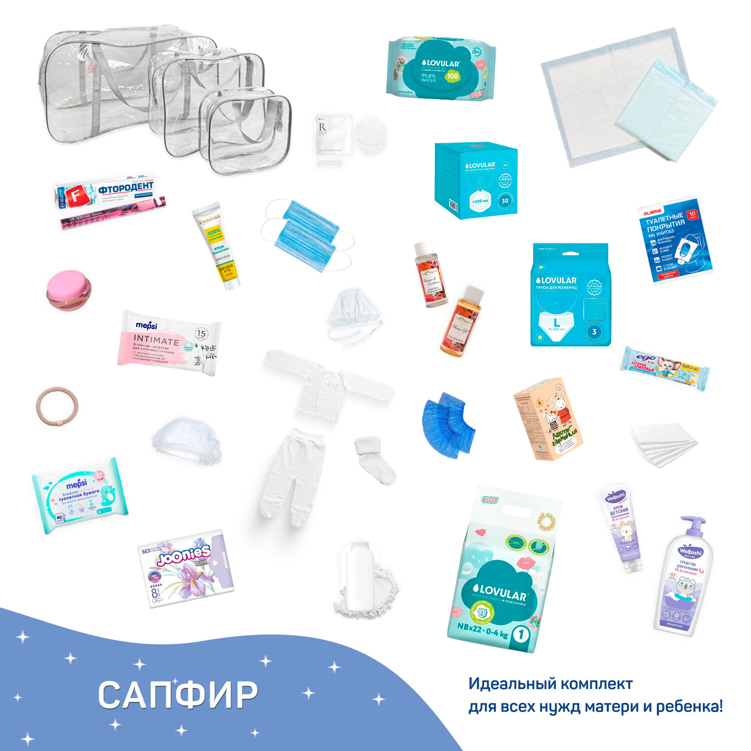 Купить Сумка в роддом готовая для мамы и малыша с наполнением, 29 предметов, 3 прозрачные сумки, комплектация "Сапфир"