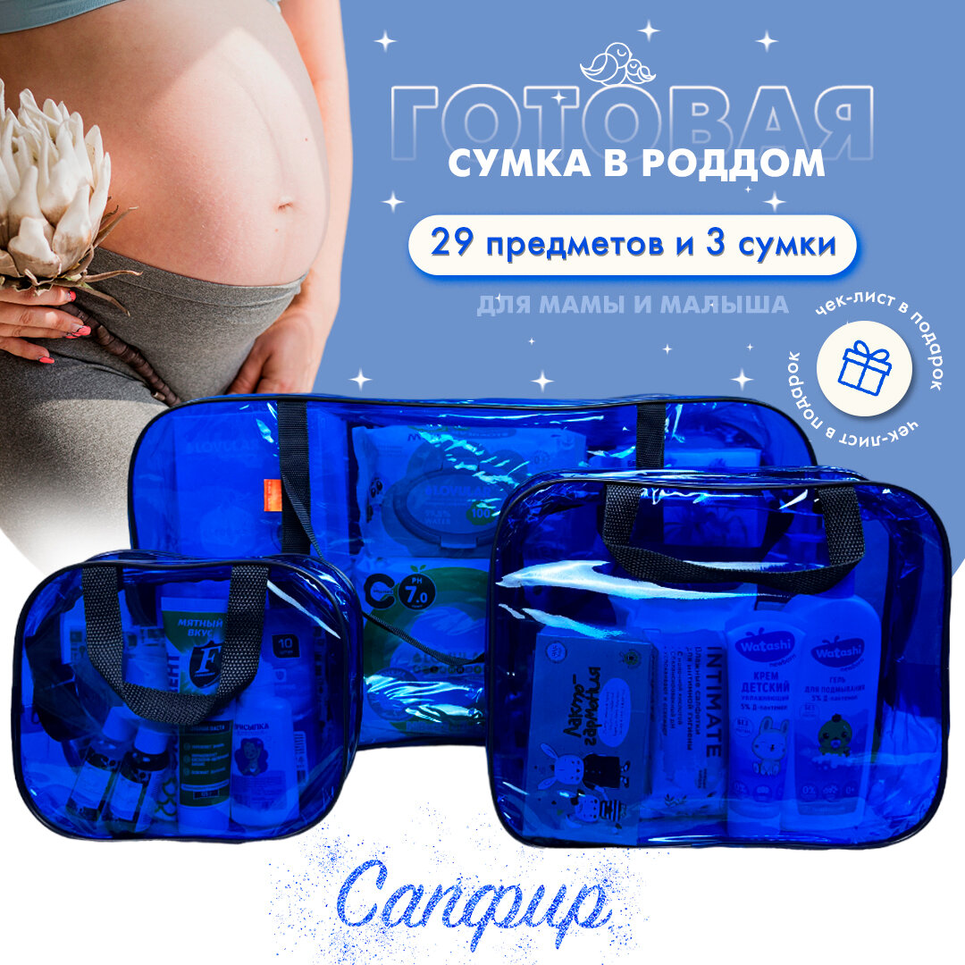 Сумка в роддом готовая для мамы и малыша с наполнением, 29 предметов, 3 прозрачные сумки, комплектация "Сапфир"