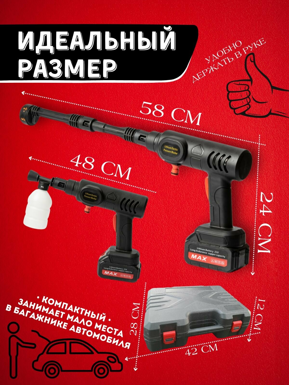| Подробная комплектация | ) Зарядное устройство, адаптер для заряда аккумулятора 2) Удобная тряпка-варежка 3) Тряпка из микрофибры 4) Быстросъемное соединение к шлангу 5) Пеногенератор ёмкость для моющего средства 6) Пистолет автомойка 7) Фильтр входной 8) Шланг длиной 5 метров 9) Насадка удлинитель 10) Насадка с удобным переключением 6 режимами мойки авто 11) Один мощный аккумулятор 21 В в комлекте 12) Подробная инструкция 13) Удобный Кейс для хранения, перевозки автомойки |