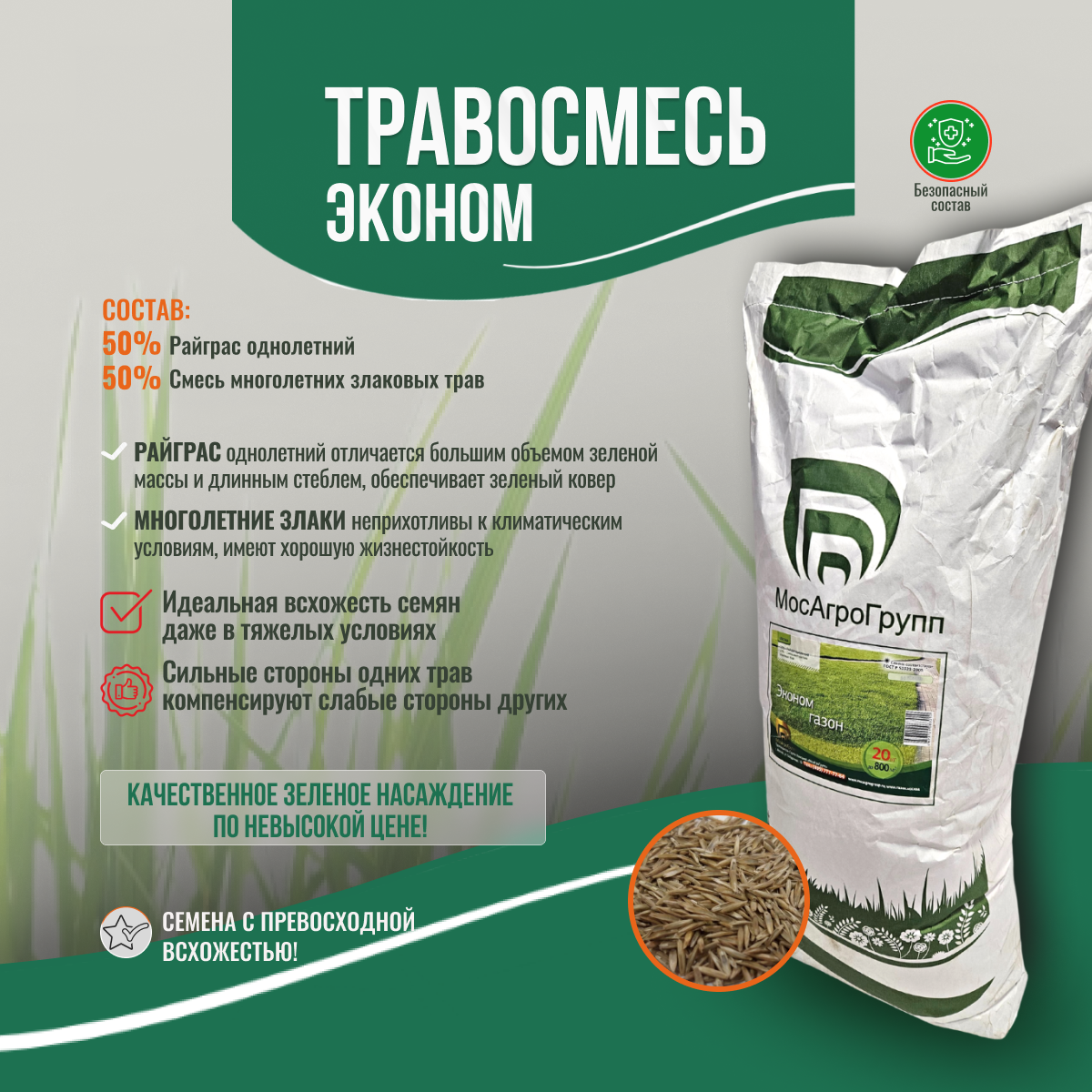 Травосмесь Эконом для газона МосАгроГрупп , 20 килограмм