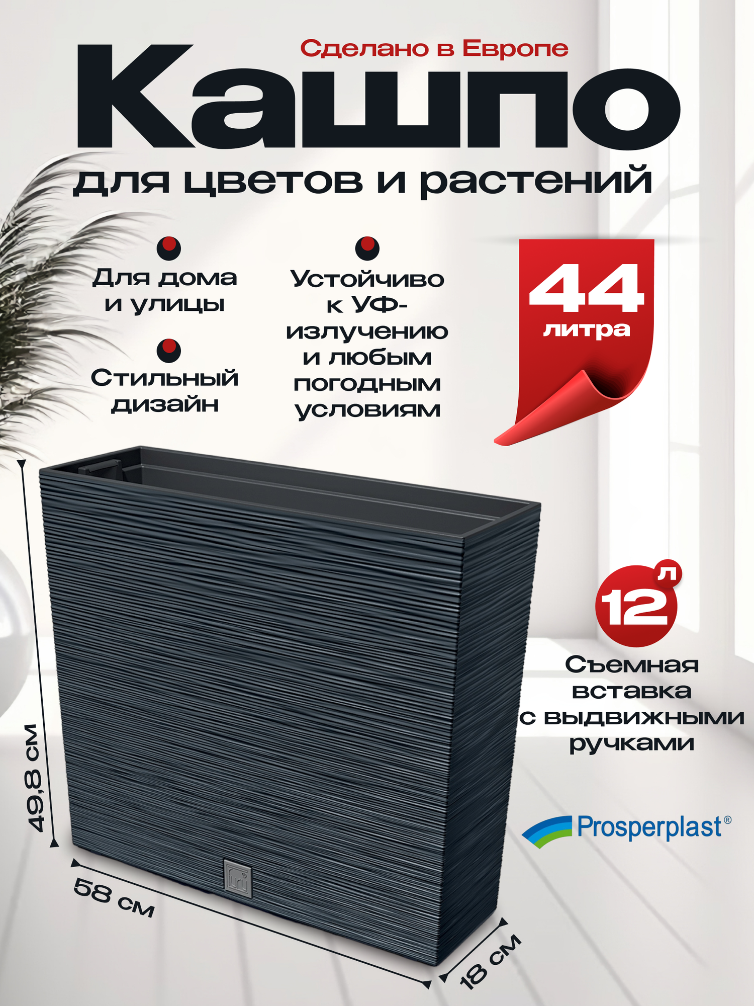 Кашпо Prosperplast для цветов напольное FURU CASE TOWER 44 л, антрацит