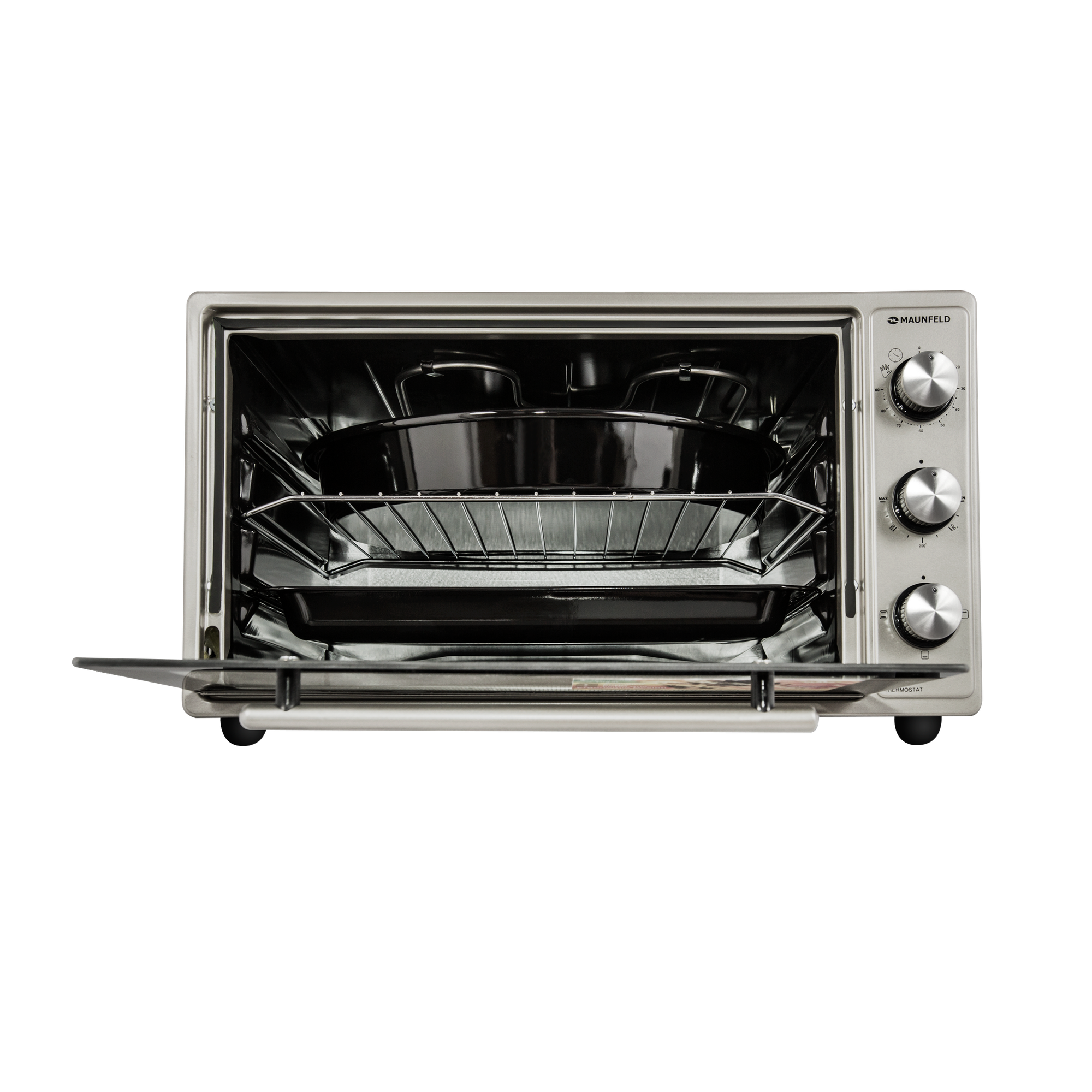 Мини-печь MAUNFELD CEMOB.363.S1/ Электрическая мини-печь, 50см, 1300 Вт, механический программатор, решетка для гриля, прямоугольный противень, круглый противень , нержавеющая сталь