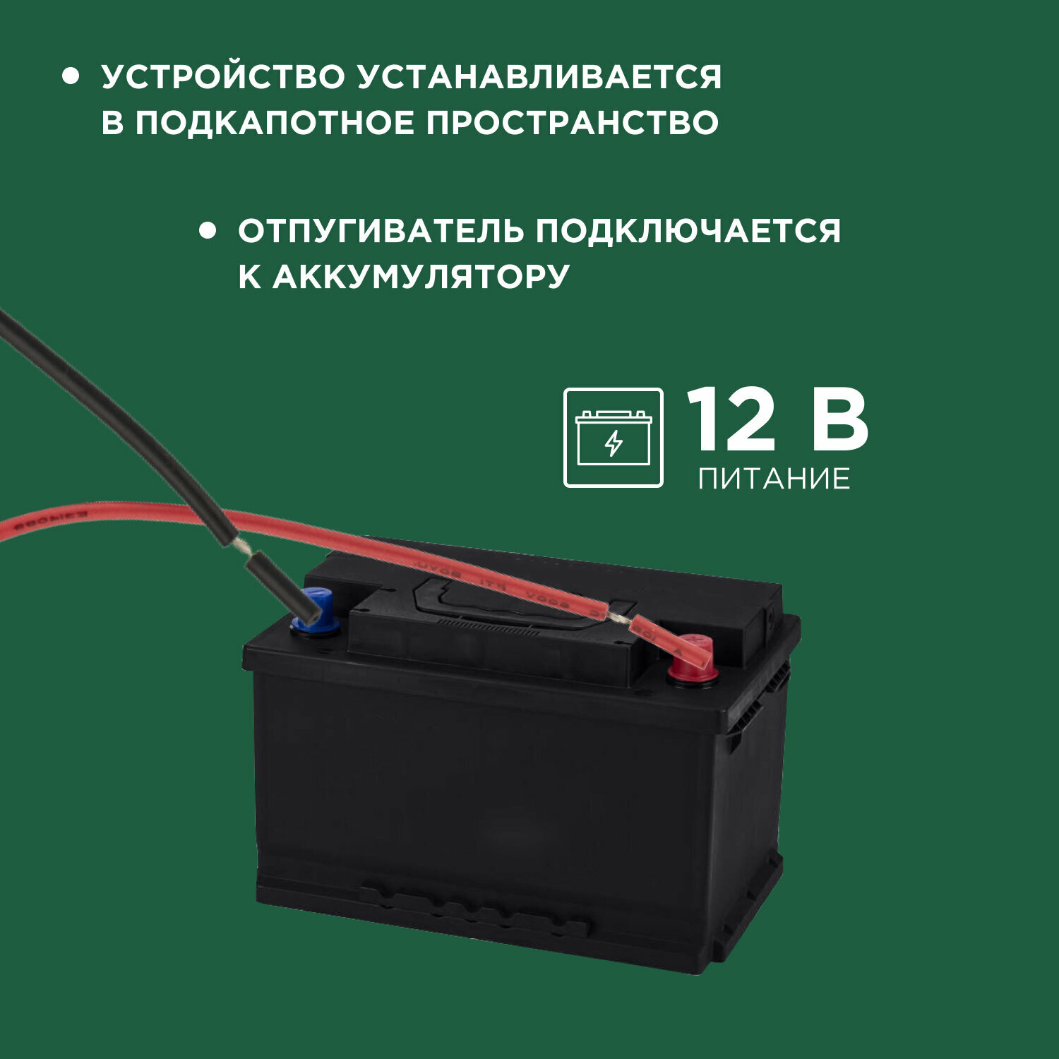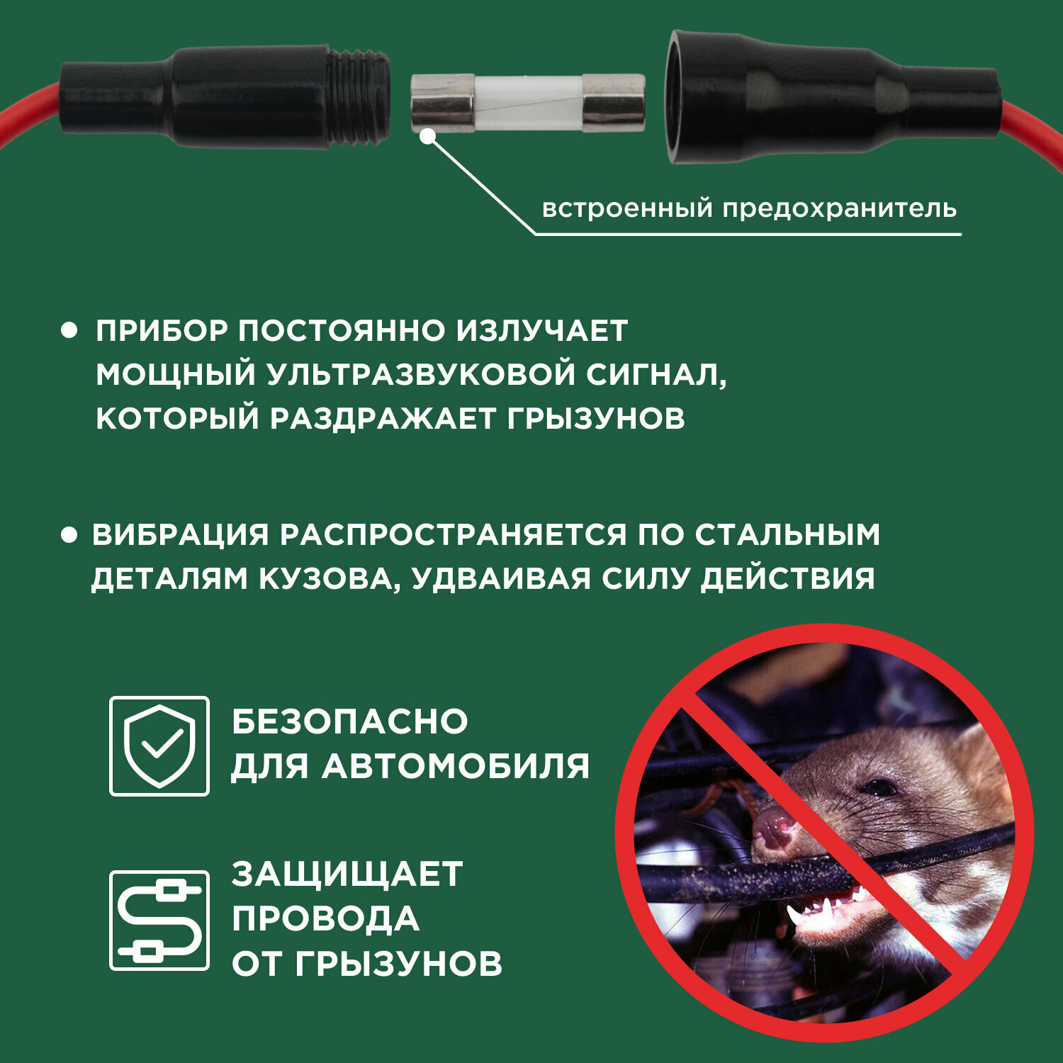 | Дополнительная информация | Отпугиватель REXANT избавит автомобиль от животных мышей, крыс , которые любят забираться в механизмы, используют их как укрытие. Прибор излучает ультразвуковые волны, которые раздражают и пугают животных. Вибрации передаются металлическим деталям кузова, что усиливает эффект. |