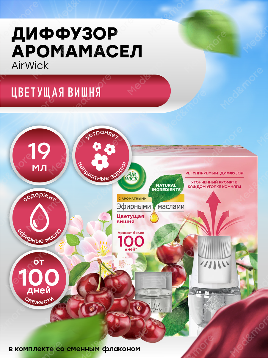 Освежитель воздуха автоматический AirWick набор: диффузор аромамасел со сменным флаконом, цветущая вишня, 19 мл