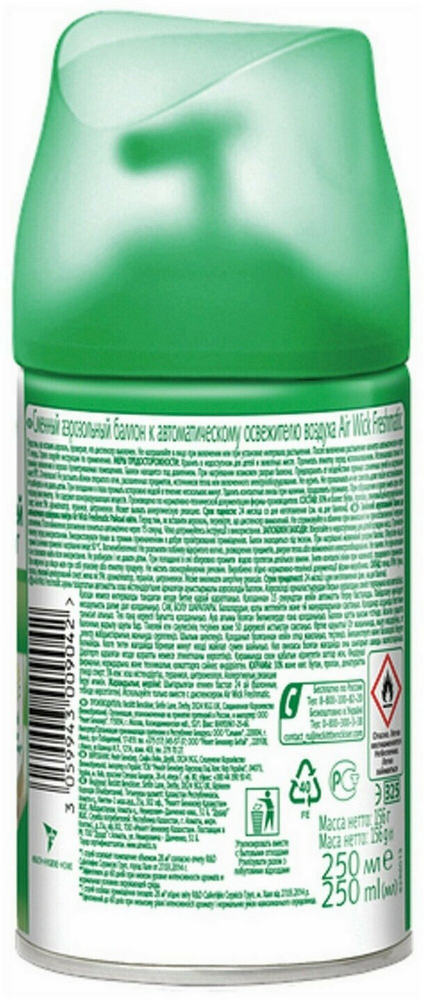 | Дополнительная информация | баллон для автоматического освежителя воздуха Air Wick Freshmatic, перед тем, как вставить аэрозоль, проверьте, что диспенсер выключен, не направляйте в лицо при включении или при установке интервала распыления, после включения распыление начнется автоматически через 15 сек |