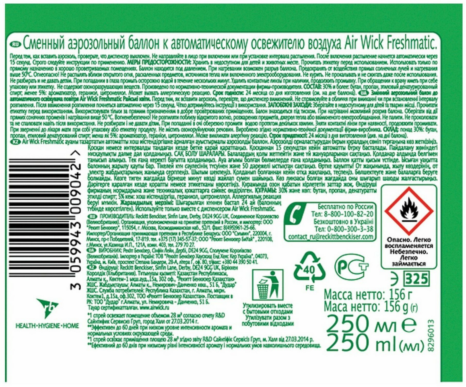 | Дополнительная информация | баллон для автоматического освежителя воздуха Air Wick Freshmatic, перед тем, как вставить аэрозоль, проверьте, что диспенсер выключен, не направляйте в лицо при включении или при установке интервала распыления, после включения распыление начнется автоматически через 15 сек |