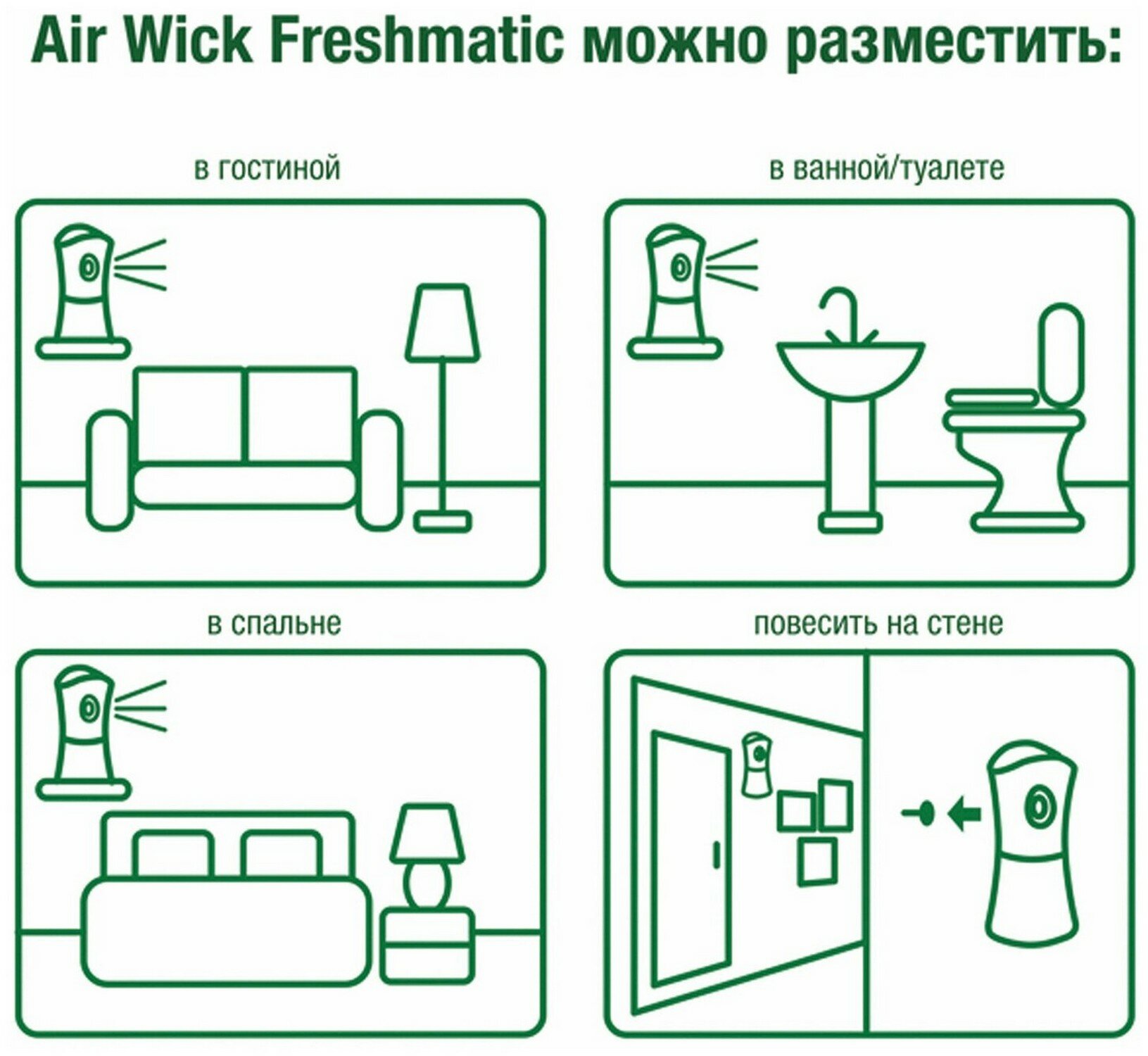 | Дополнительная информация | баллон для автоматического освежителя воздуха Air Wick Freshmatic, перед тем, как вставить аэрозоль, проверьте, что диспенсер выключен, не направляйте в лицо при включении или при установке интервала распыления, после включения распыление начнется автоматически через 15 сек |