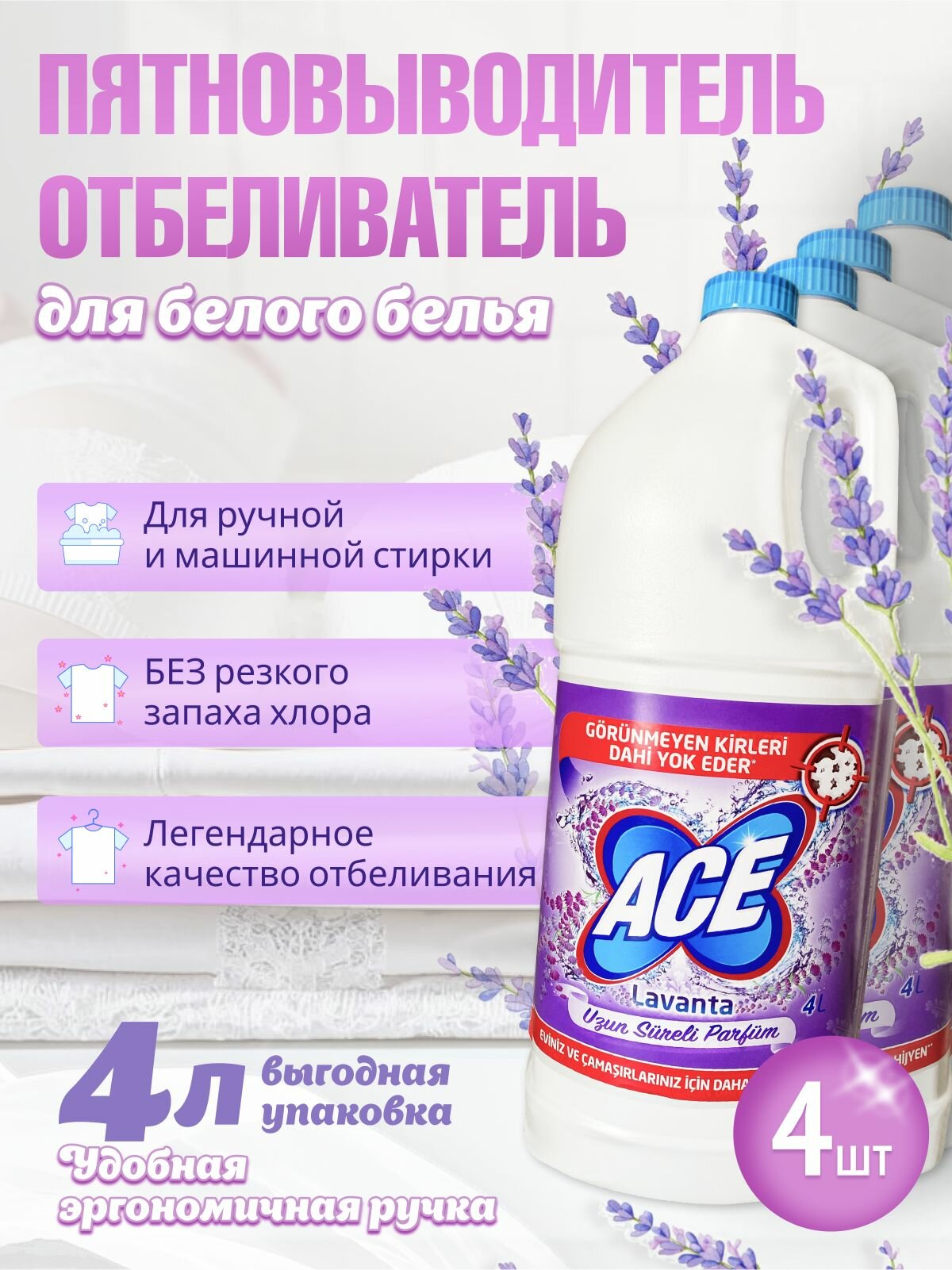 Купить ACE "Лаванда" отбеливатель и пятновыводитель для белого белья 4л 4шт