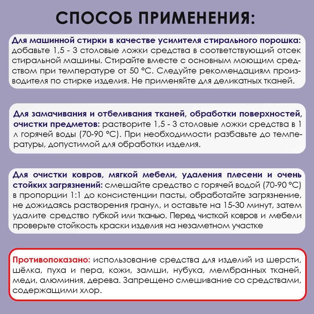 | Способ применения | РУЧНАЯ СТИРКА 1. В 4-х литрах горячей воды растворить 1* ложку отбеливателя. 2. Замочить бельё на 1-2 часа. 3. Прополоскать или,при необходимости постирать с обычным моющим средством. МАШИННАЯ СТИРКА 1. Добавить 1* ложку отбеливателя в отсек стиральной машины. 2. Стирать вместе с основным моющим средством при температуре от 50 оС. |
