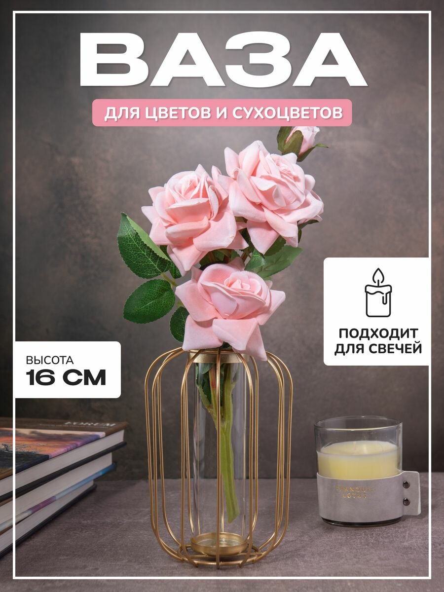 Ваза для цветов и сухоцветов, стеклянная, 16 см, золотистый/прозрачный