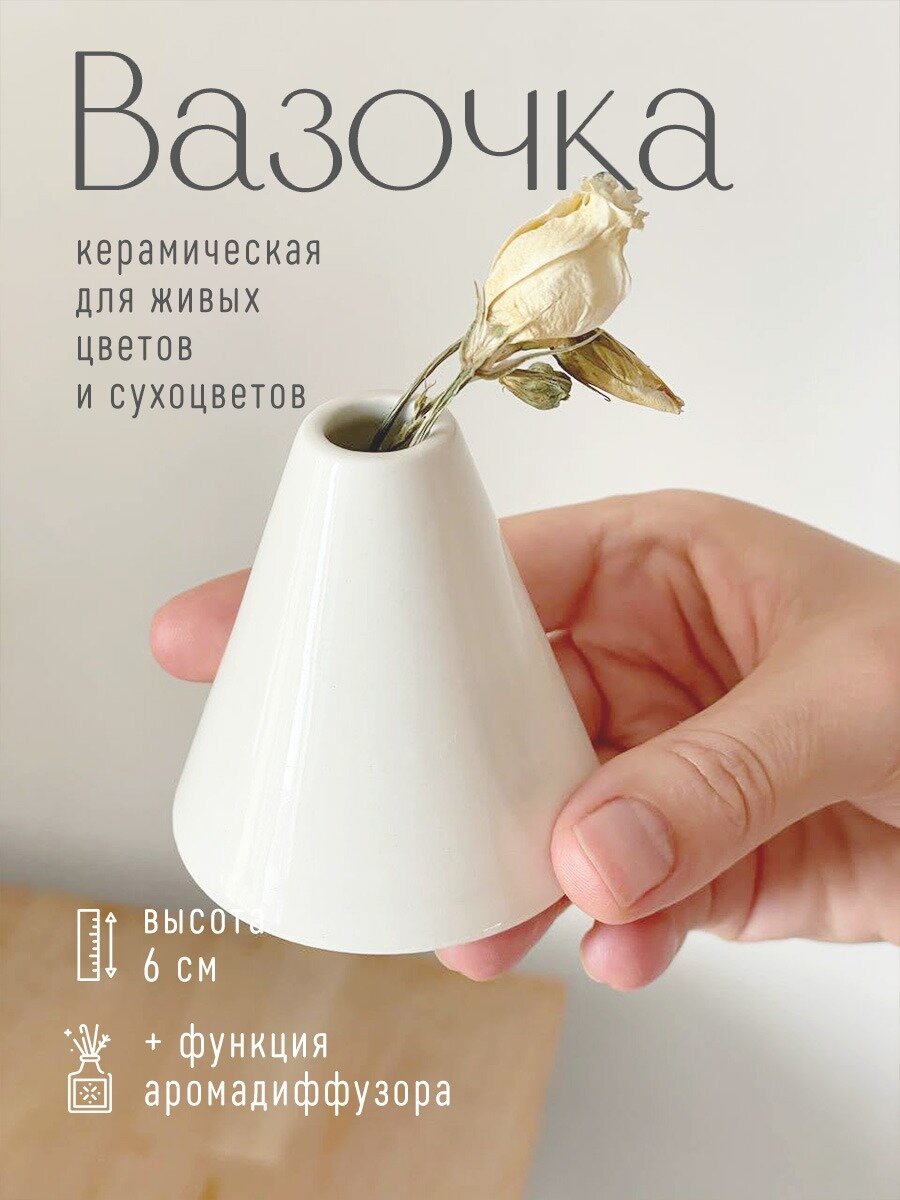 СохранитьМаленькая декоративная керамическая ваза для живых цветов и сухоцветов Decologic конус интересное: