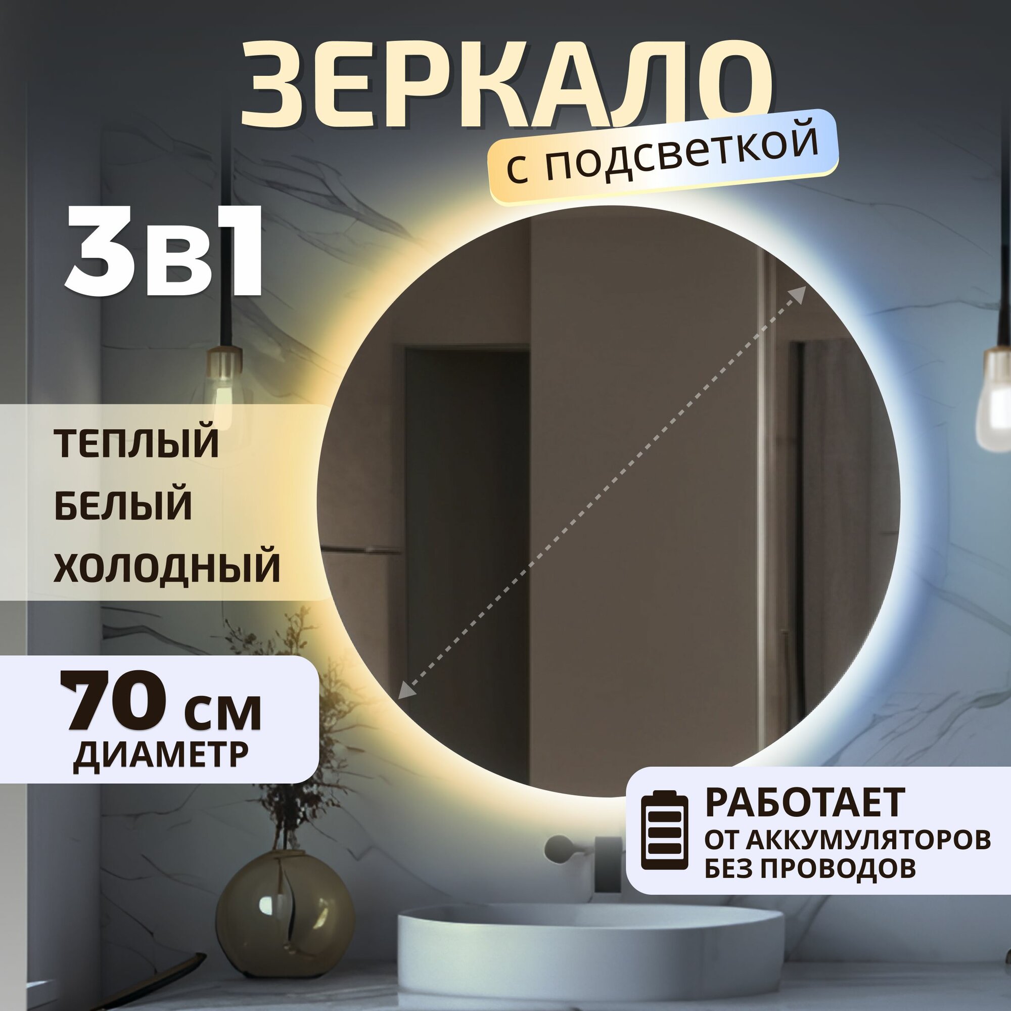 Купить Зеркало настенное с подсветкой на аккумуляторе + зарядное устройство, круглое 70 см. Три режима подсветки