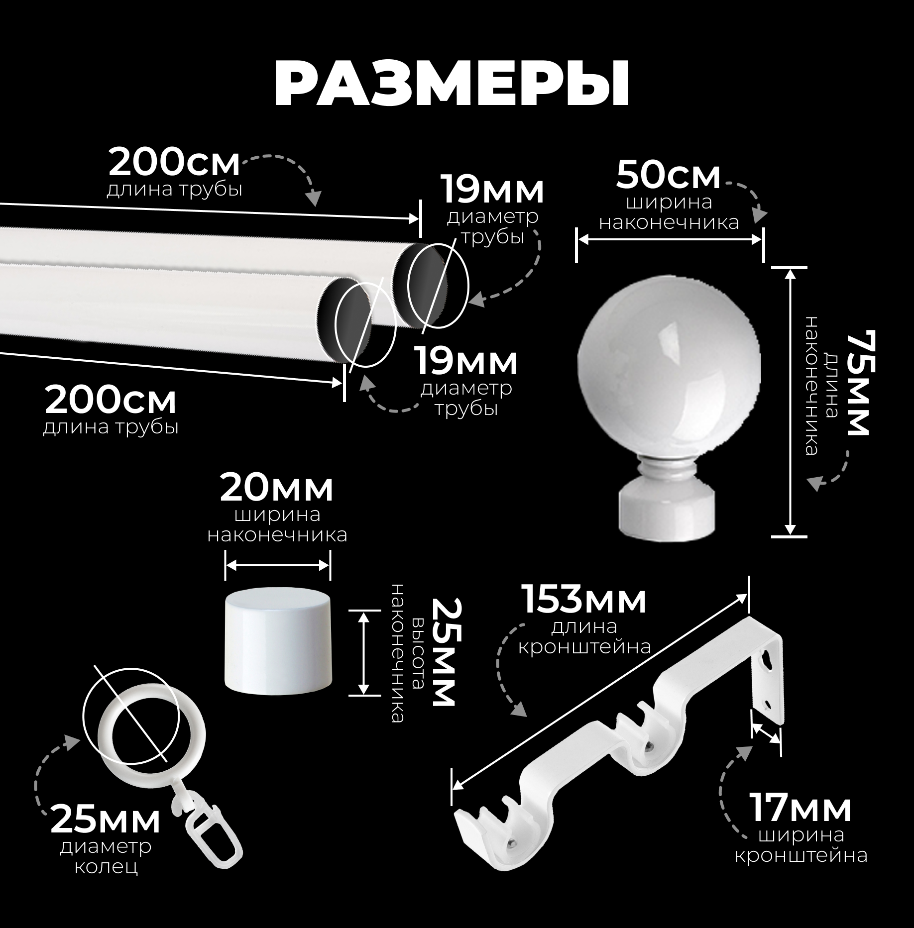 | Комплектация | Труба металлическая гладкая Ø19 мм - 2шт; Наконечники металлические - 2 шт; Заглушка - 2 шт; Кронштейны металлические; Кольца пластиковые + крючки; Комплект крепежа (дюбеля, шурупы). |