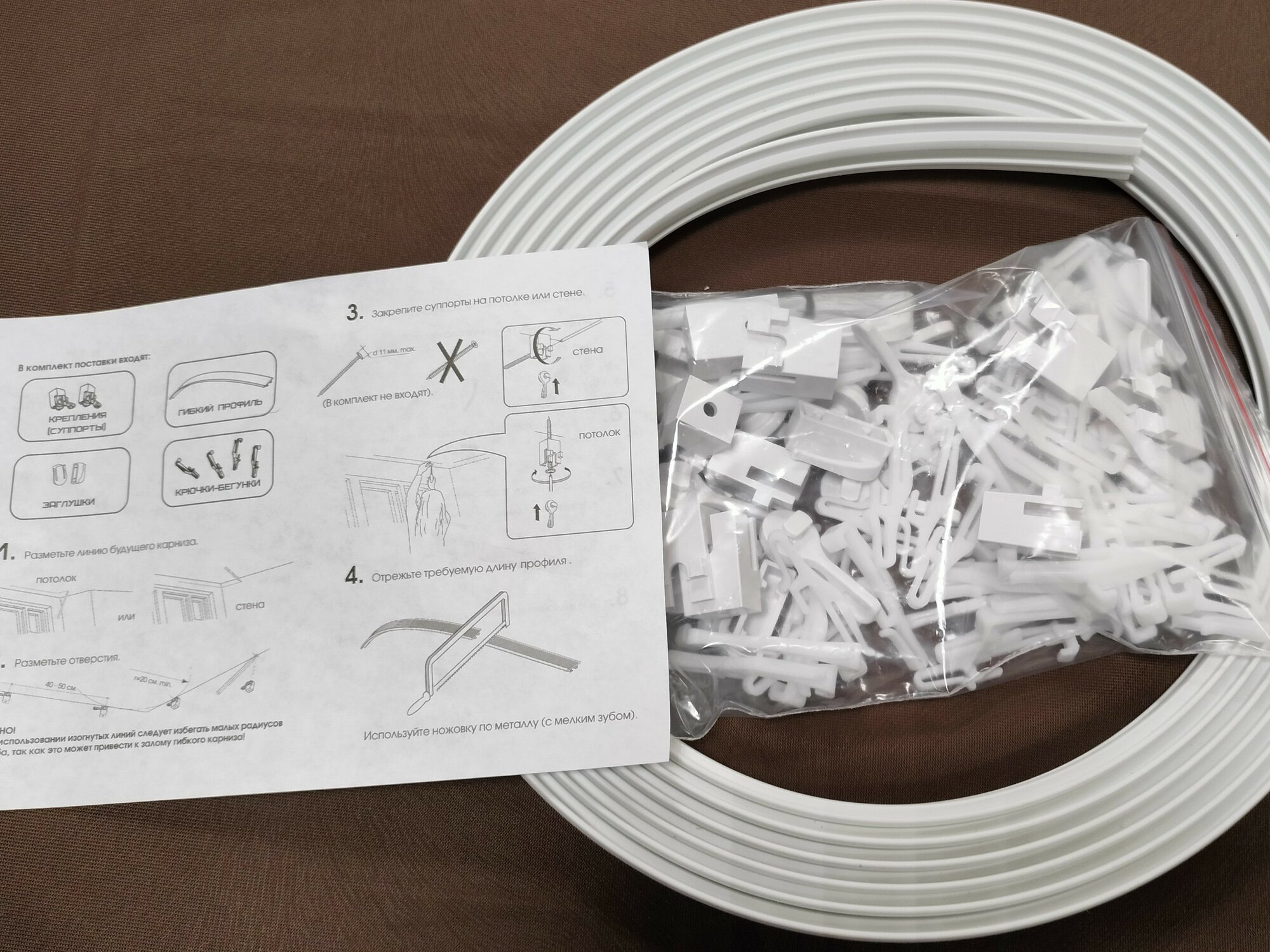 | Комплектация | Гибкий профиль (высота 25мм, ширина 5 мм) - 5 м; Крепление (суппорт) - 11 шт; Заглушка - 4 шт; Крючок - 50 шт. |