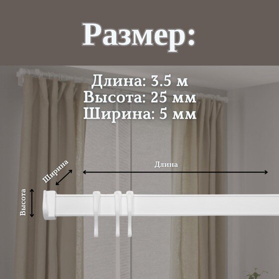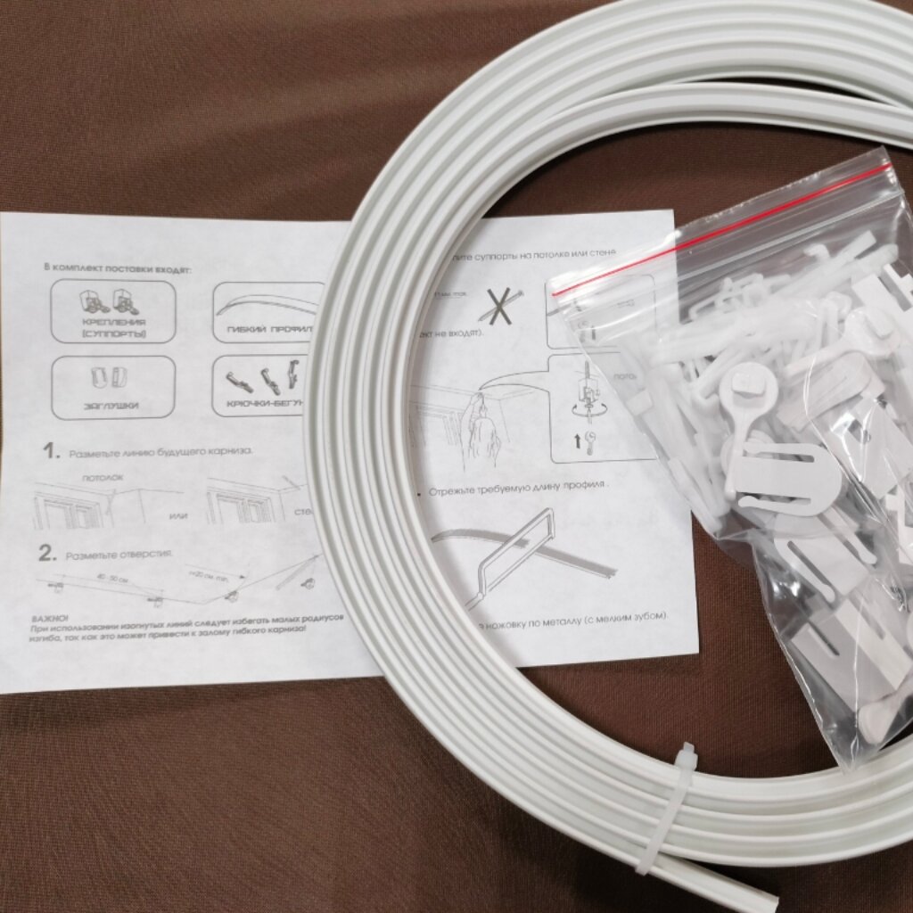 | Комплектация | Гибкий профиль (высота 25мм, ширина 5 мм) - 3,5 м; Крепление (суппорт) - 8 шт; Заглушка - 4 шт; Крючок - 35 шт. |