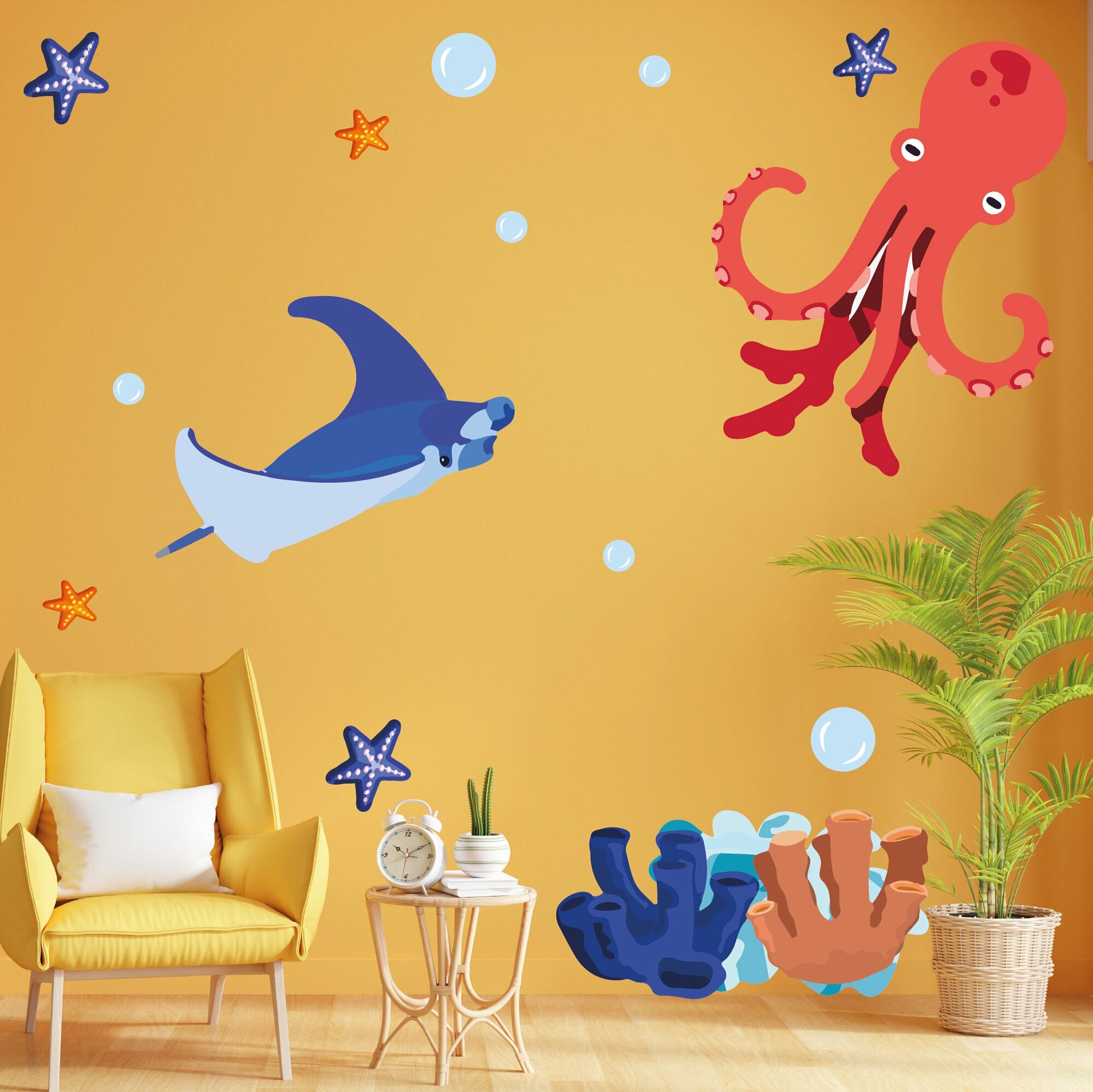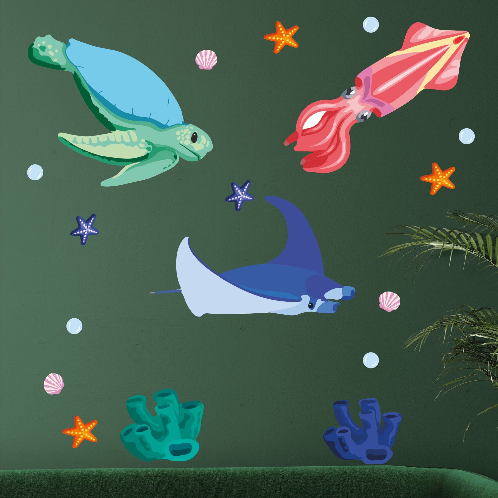 Купить Красивые детские влагостойкие наклейки интерьерные на стену морские животные черепаха скат кальмар осьминог морской конек кораллы для украшения ванной комнаты детской интерьера