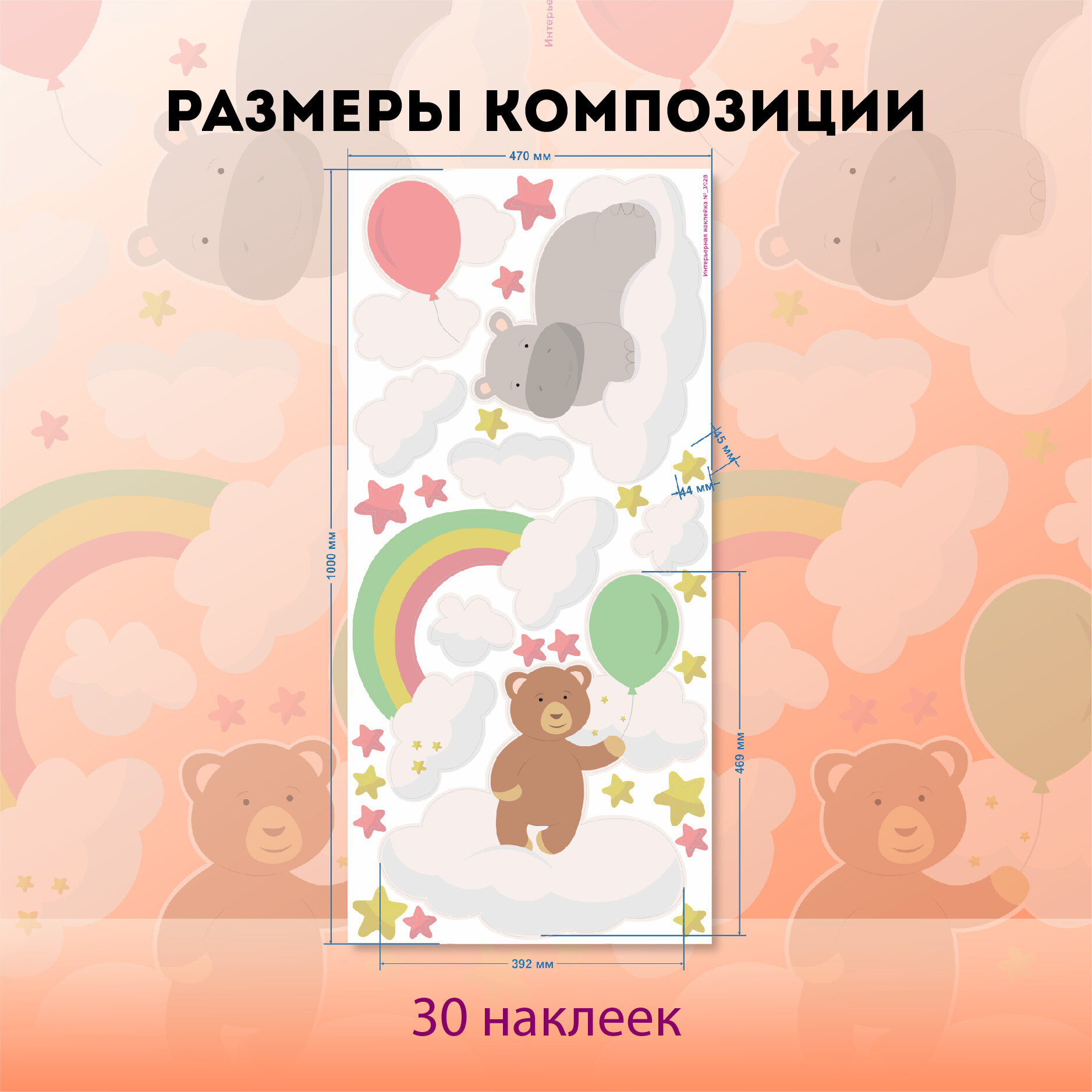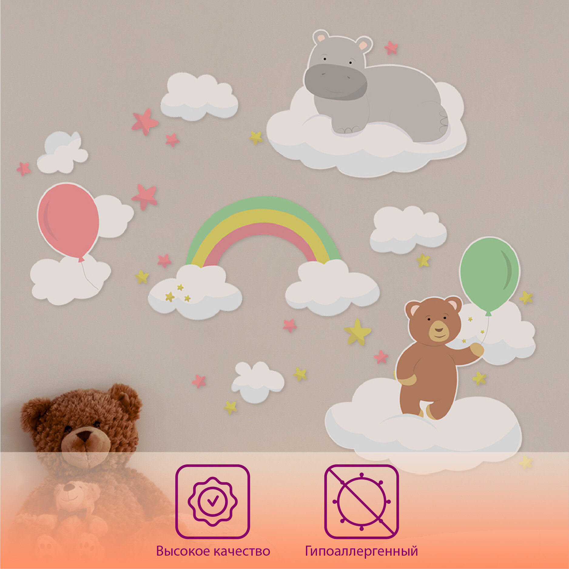 Большие интерьерные наклейки в детскую/игровую зону/детский сад Звери на воздушных шарах