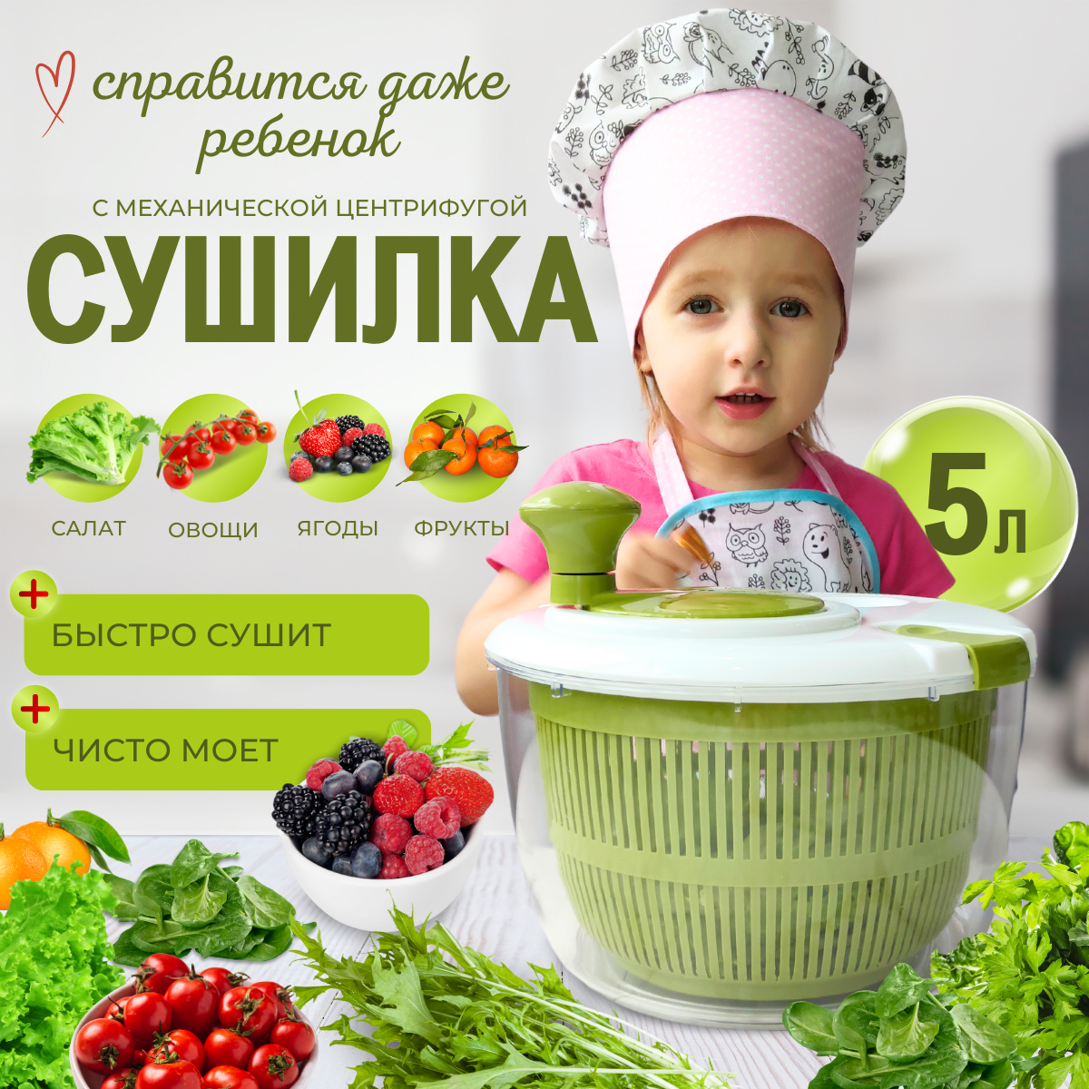 Сушилка для салата и зелени, центрифуга для салата и зелени, овощей и фруктов, объем 5 литров. интересное: