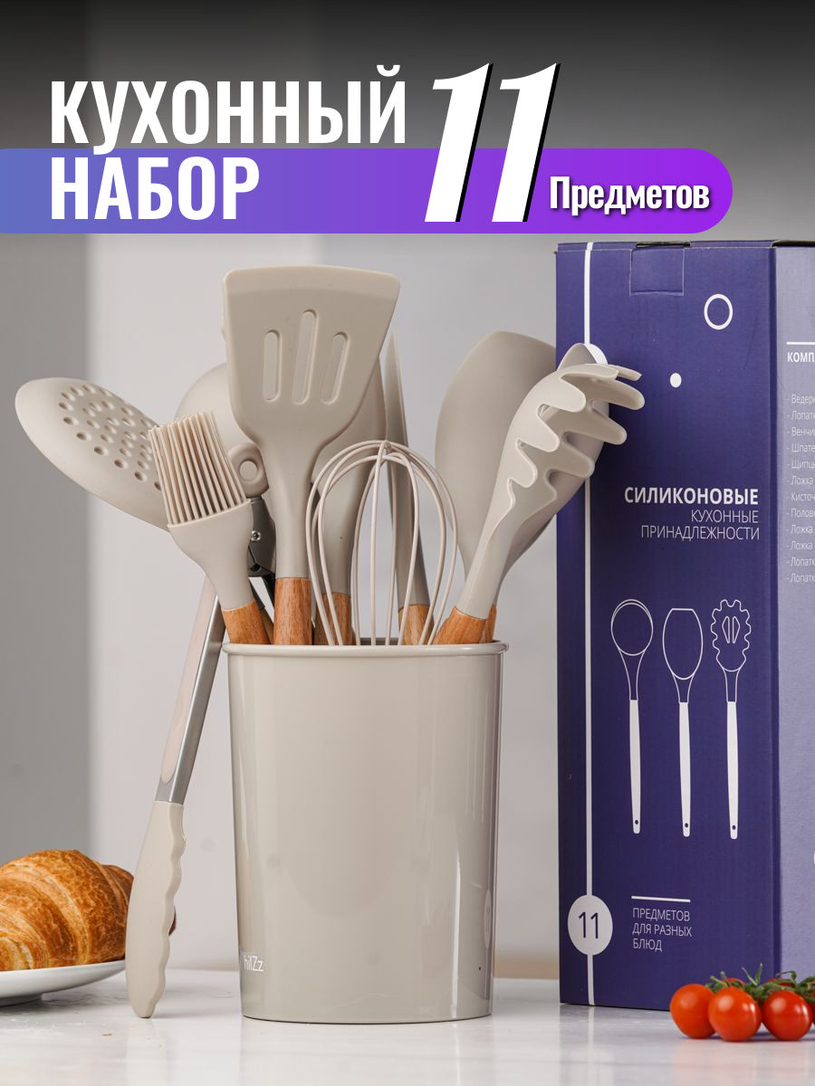 Купить Набор кухонных принадлежностей силиконовый с подставкой, агатово-серый
