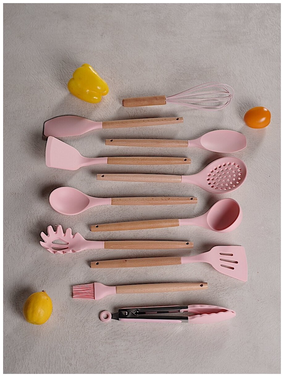 Купить Набор кухонных принадлежностей силиконовый с подставкой, розовый