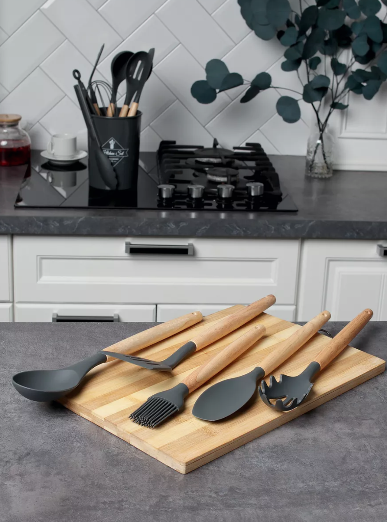| Состав набора | венчик / кисть кулинарная / ложка для соуса / ложка для спагетти / ложка поварская / ложка-дуршлаг / лопатка / лопатка для блинов / половник / шумовка / щипцы |