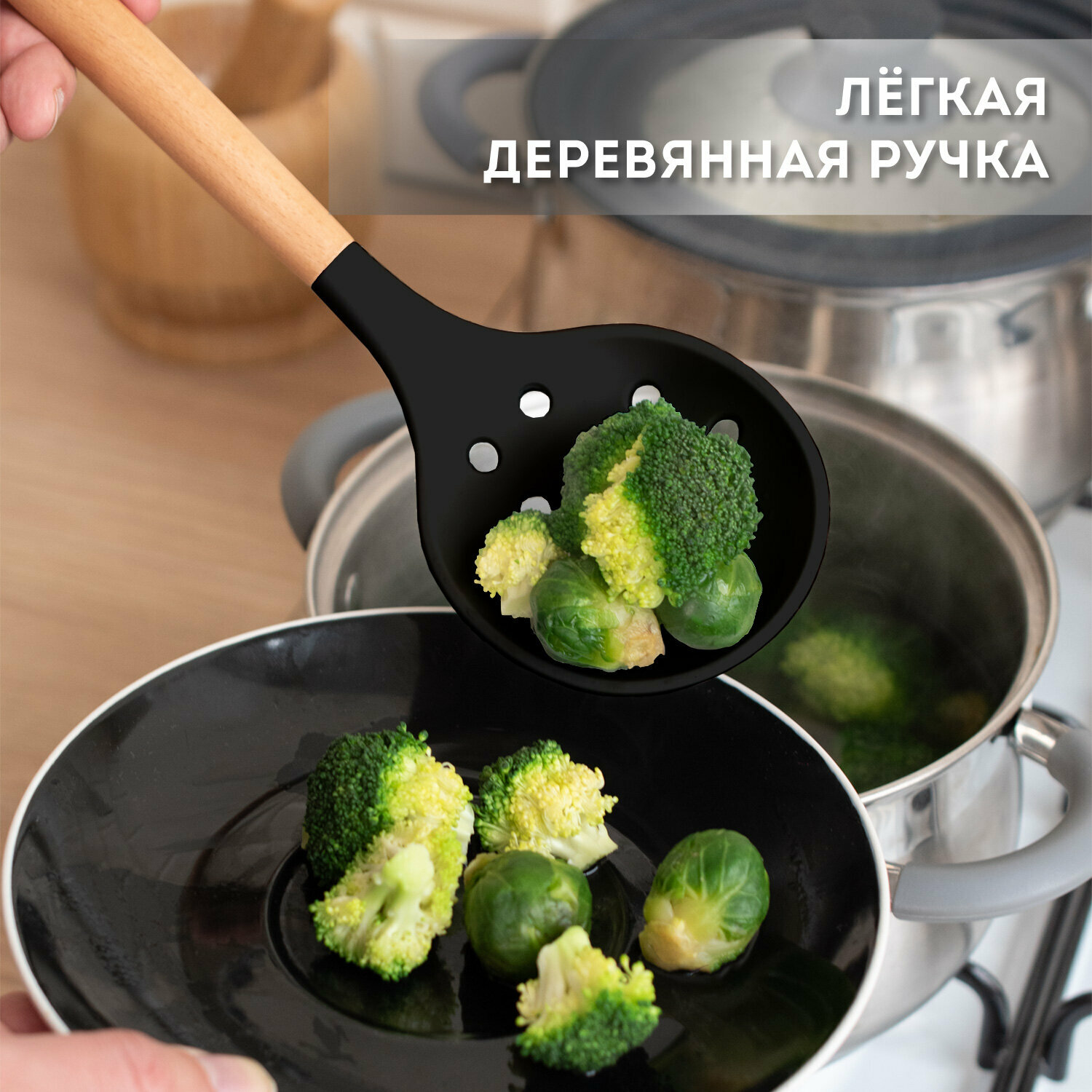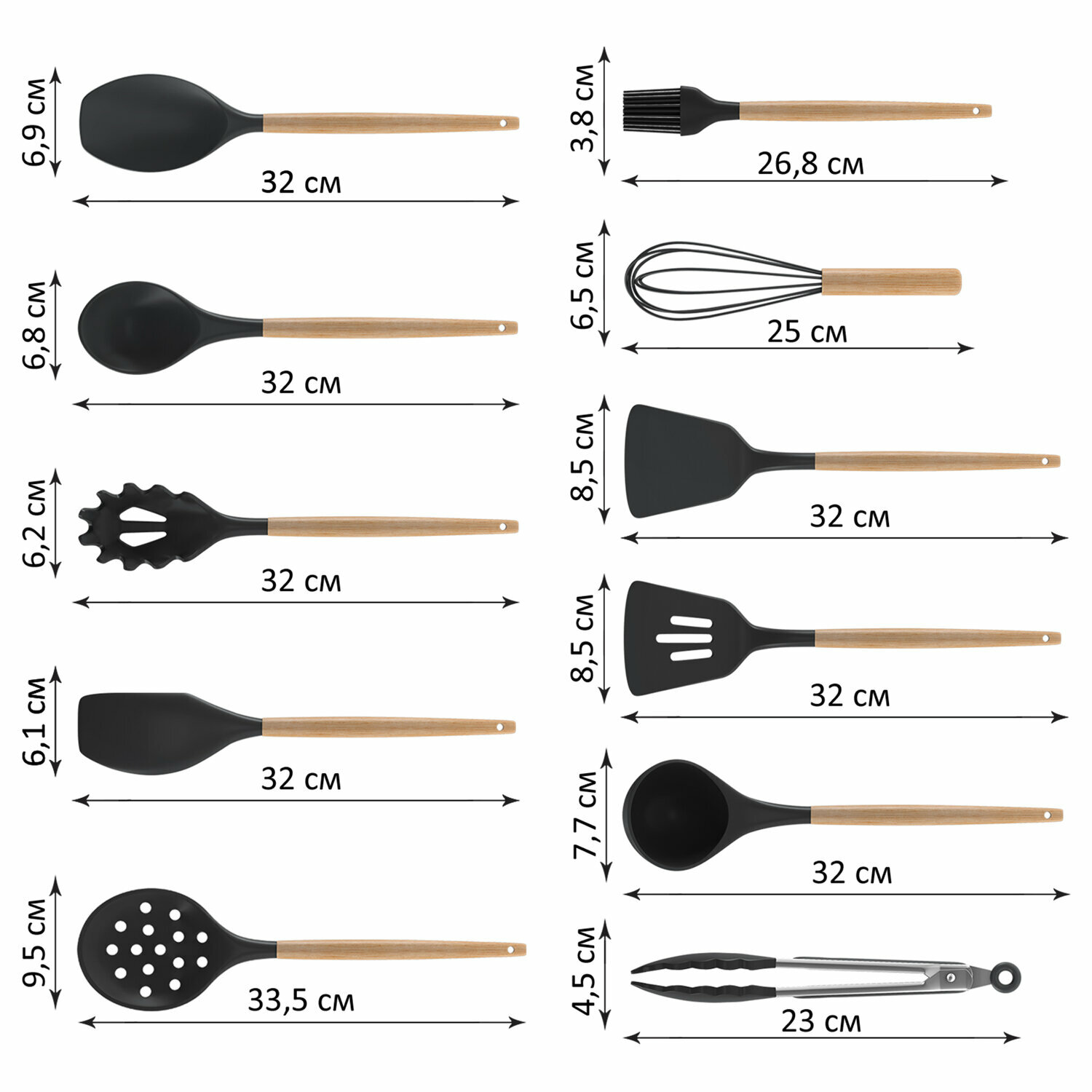 | Комплектация | В набор входит 11 предметов из пищевого силикона с деревянными ручками, а также подставка и держатель из пластика. В набор входят самые необходимые аксессуары для кухни: удобная лопатка для жарки, шпатель, венчик, щипцы, плоская ложка для выпечки, лопатка с отверстиями для слива масла, половник, ложка для салата, кисточка для масла, ложка для спагетти и шумовка. А так же подставка. |