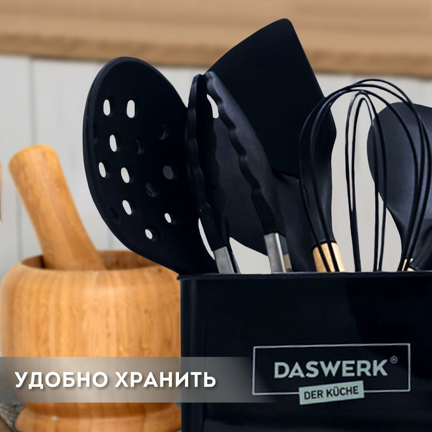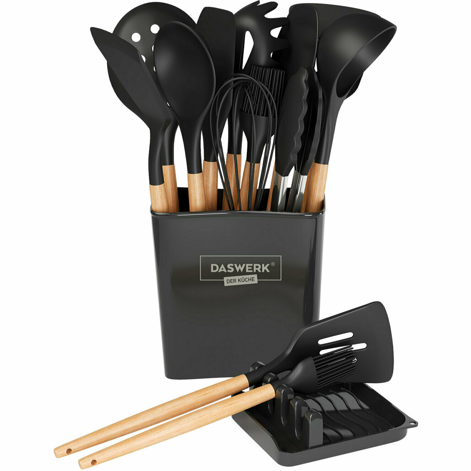 Набор кухонных принадлежностей силиконовых с деревянными ручками 13 в 1, черный, Daswerk, 608197 интересное: